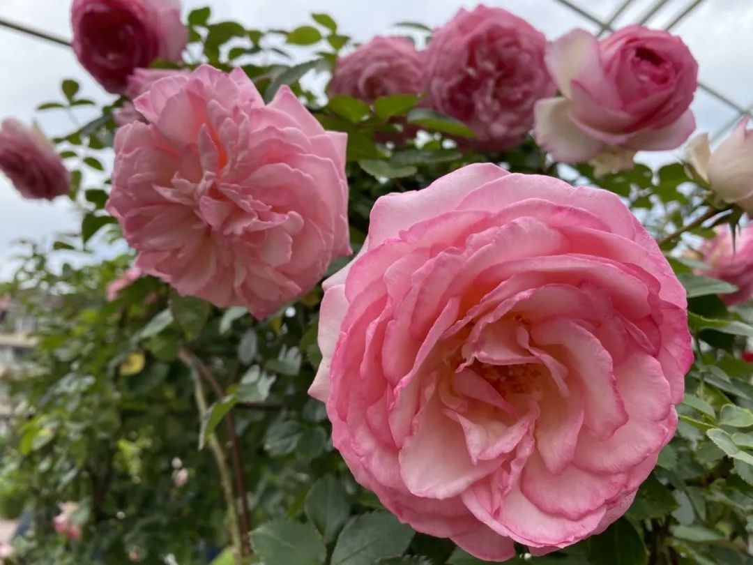 心形的花架上,一朵朵月季向阳而生仿佛点点繁星将爱心点亮,娇艳的花朵搭配巧妙的设计引得来往游客赞不绝口。据悉,这两个心形花架是公园于2020年初新建的英式拱形花架,上面种植了“龙沙宝石”“艾弗玫瑰”等80余株攀援月季。