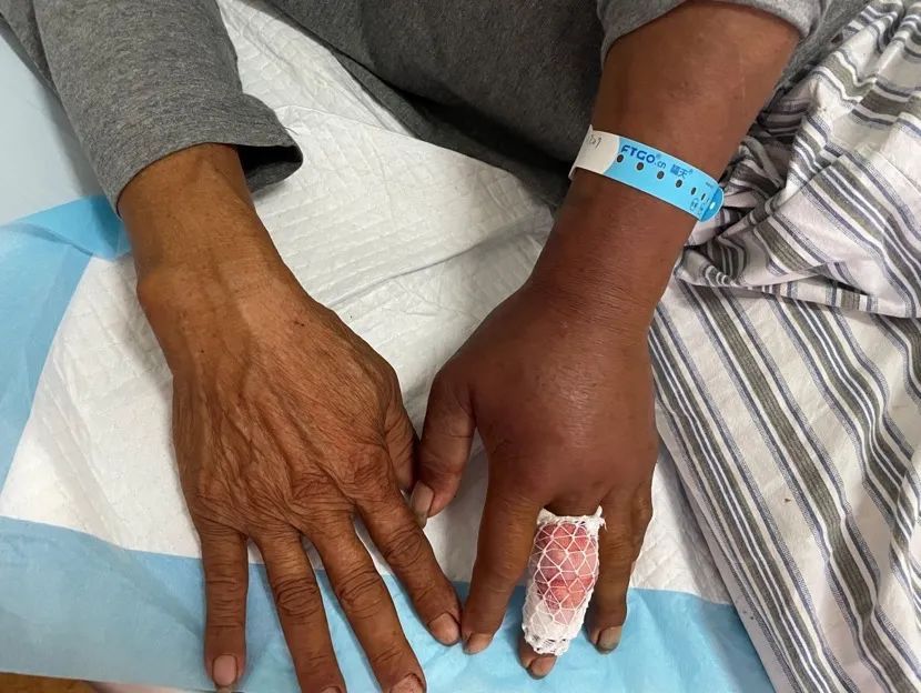 一位男性患者在清明扫墓时,被不知名毒虫咬伤,局部受伤情况较严重,手腕处出现组织坏死、发青发黑、长皮疹的情况,五根手指也肿胀得粗了一圈。