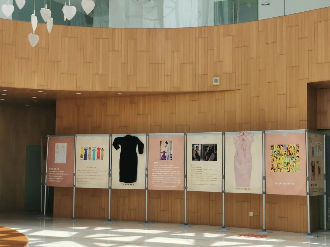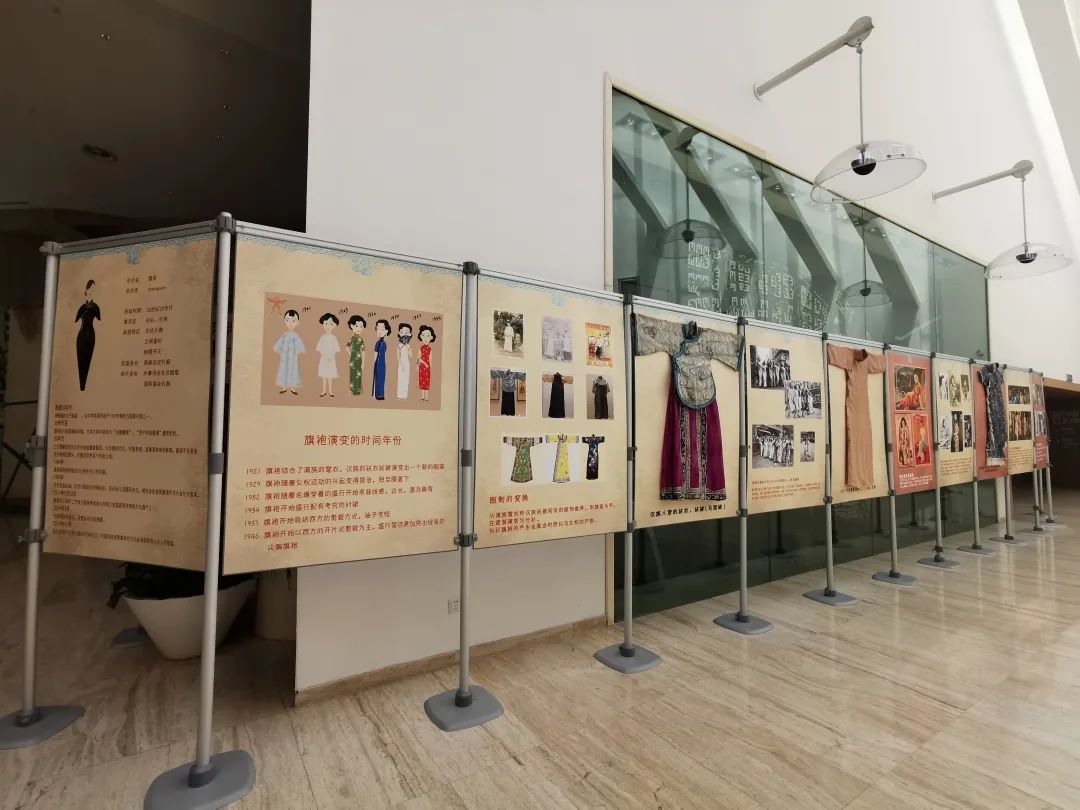 在一楼展厅的显眼位置,按着时间的顺序,展览的旗袍依次排开,一件件旗袍散发着亮丽素雅的颜色,为了顺应观众观看的需求,现场还特意布置了展板作为旗袍的介绍,让观众通过展览可以了解到更多的相关知识。