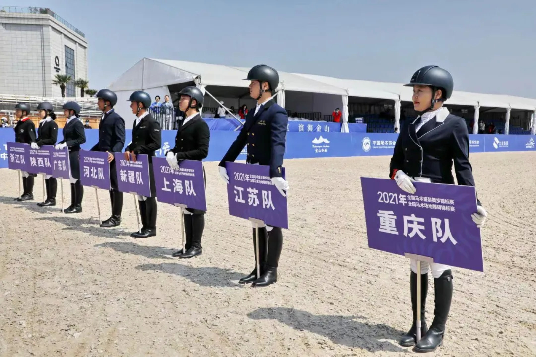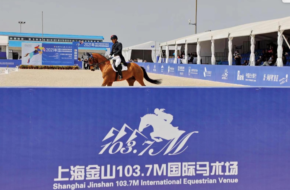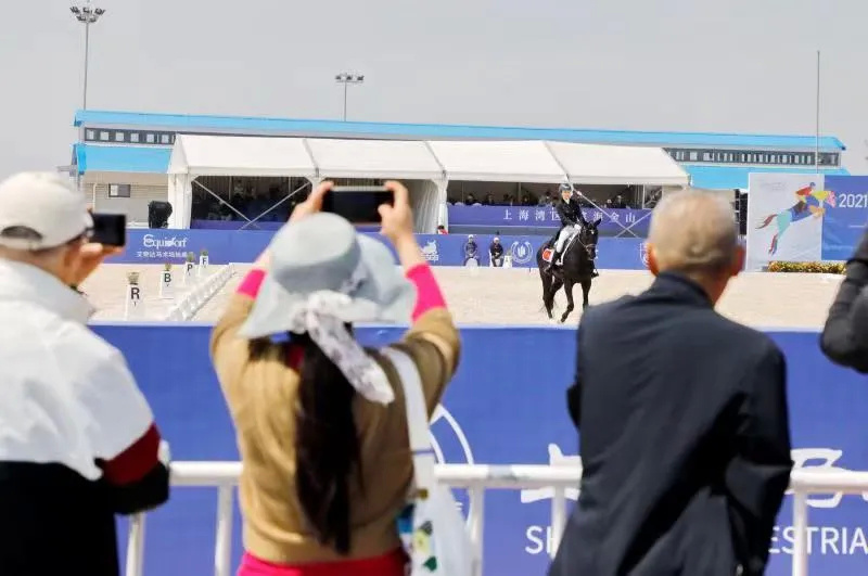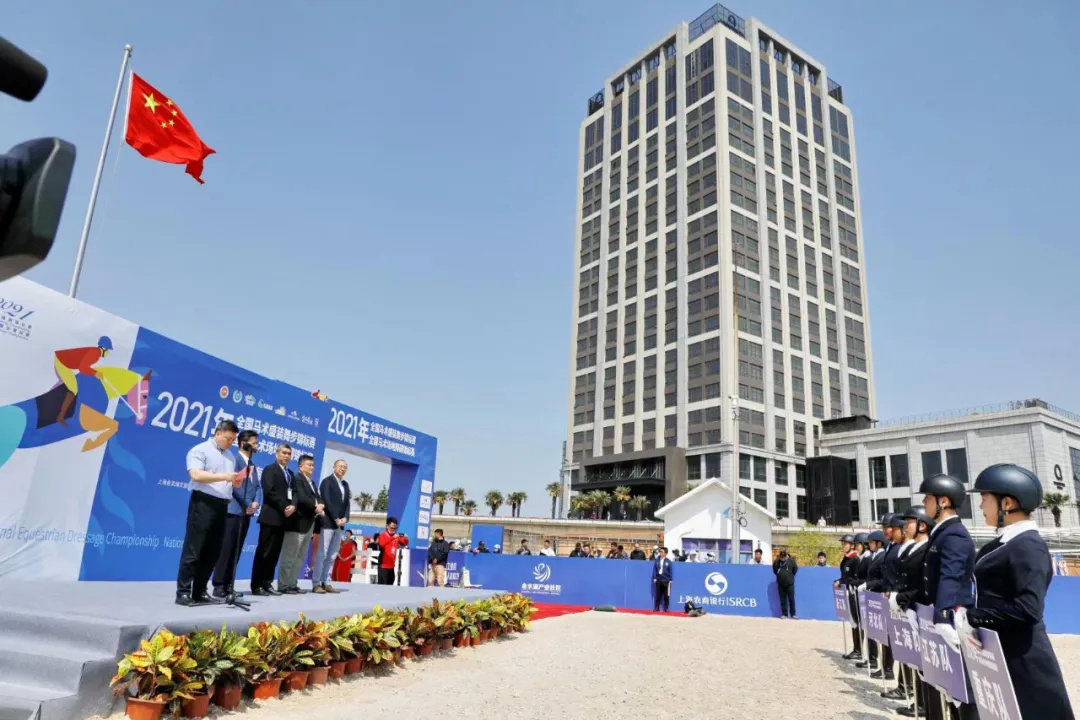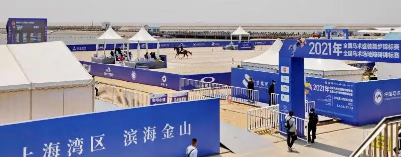 正值五一小长假, 5月3日上午,2021年全国马术盛装舞步锦标赛和全国马术场地障碍竞标赛开幕式在金山城市沙滩举行。