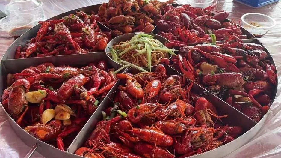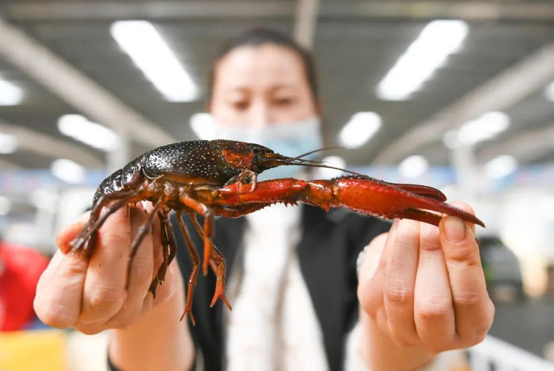 △资料图|湖北潜江中国小龙虾交易中心,虾商在展示“青炮”小龙虾。