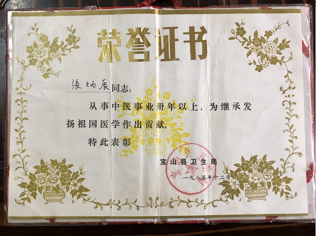 “ 我的父亲叫张炳辰,原名叫张德正。封建家庭大家分割时,后辈对长辈比较孝敬,我爷爷自己创业奋发,自己经商做做小生意。后来开了酒作坊,慢慢初具规模, 有点钱开始买田买地了。我爷爷呢发现在所有行业里医道是行善的,解救劳苦大众的,又不是重体力活,又能赚钱,就(让儿子)去行医。”