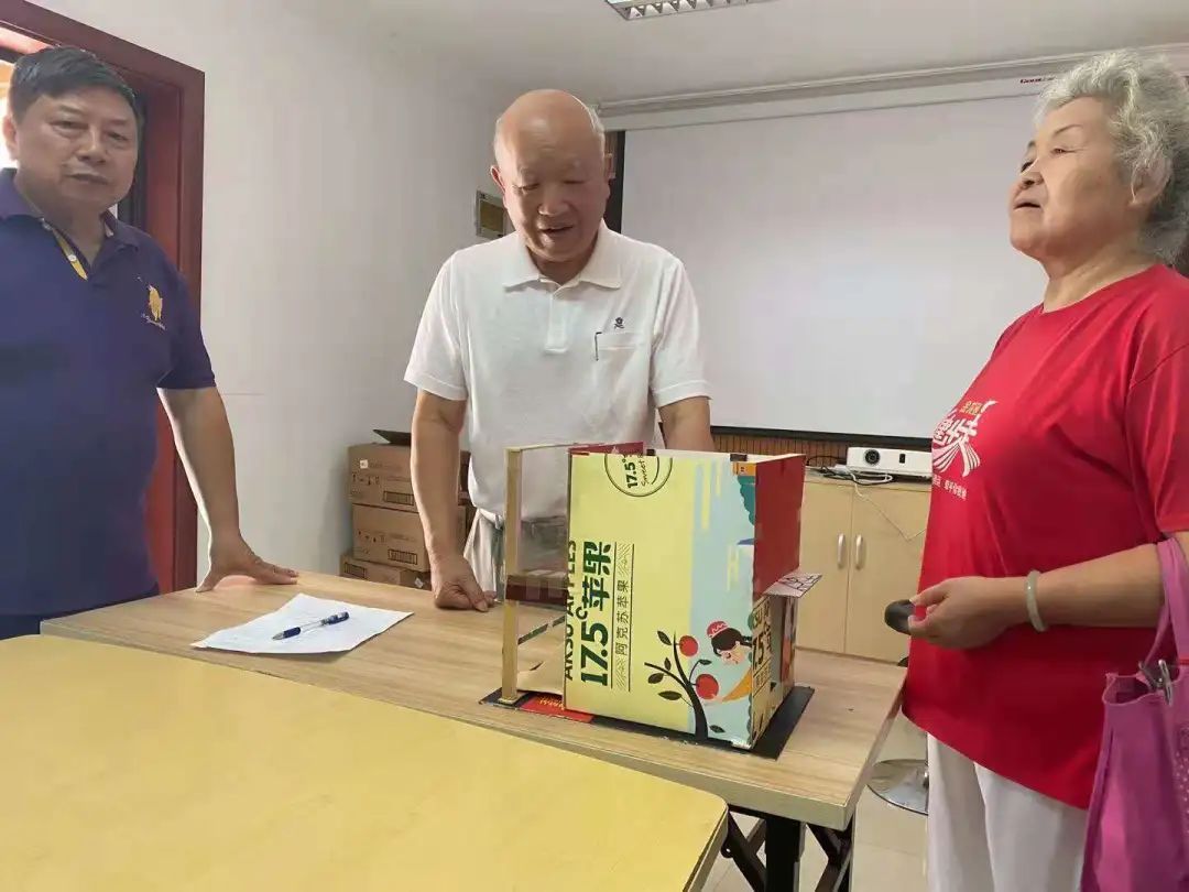 通过自治小组、小区居委、物业等多方的不懈努力,30号楼的加装电梯工作终于提上了日程。然而对冯福明和他的组员而言,他们还想着为居民们做得更多些,考虑得再周到些。“加装电梯对于住在一楼的居民来说,多多少少会产生些负面影响,比如采光、比如隐私等等。”冯福明说。“我和几户居民一起去各电梯厂实地考察,在居民表决后,最终敲定了合作厂家和电梯类型。”根据效果图,建成后的电梯将采用西进东出的进出方式,原先的大门继续得以保留,如此一来,家住一楼的居民仍可以从原先大门进入,日常的采光和通行丝毫不受影响,而采取商用货梯上常见的双贯通门设计,使得居民进出电梯更加有序方便。为了让居民们更为直观的了解电梯的构造,冯福明还特意花了两天时间,纯手工“打造”了一个电梯模型。“电梯要造了,居民们很是期盼,但是包括我在内,大部分的居民看不懂结构图纸,所以我就用家中剩余的瓦楞纸做了一个模型,这样一来,给居民们做介绍时,也能更为直观一些。”