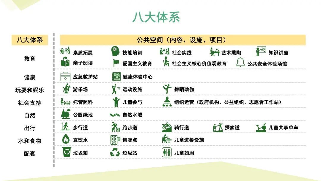 制定儿童友好公共空间建设标准,将可达性、安全性、趣味性等七大要素和教育、健康、玩耍和娱乐等八大体系纳入滨江整体规划设计中,嵌入一批包括道路交通、公共设施、直饮水、绿化景观等能体现儿童友好规划理念的示范点。