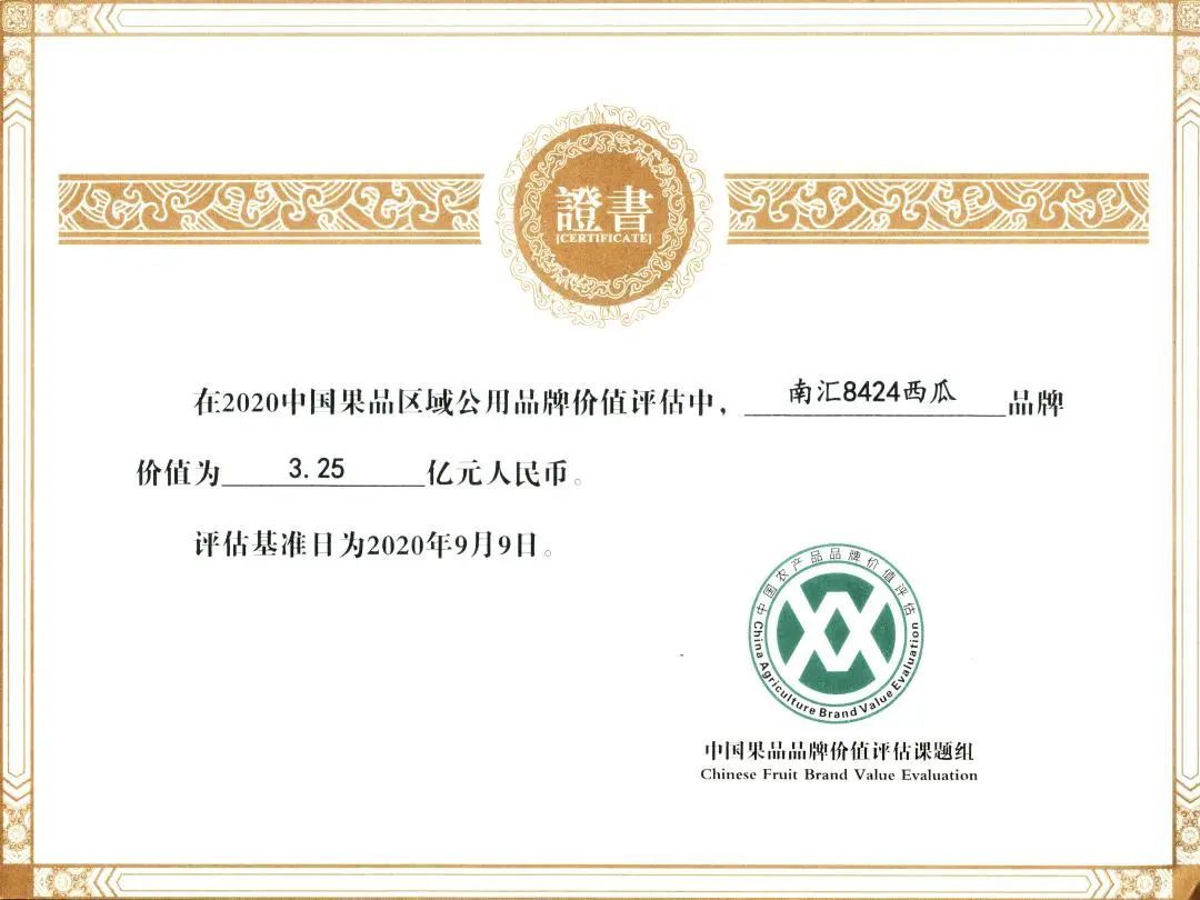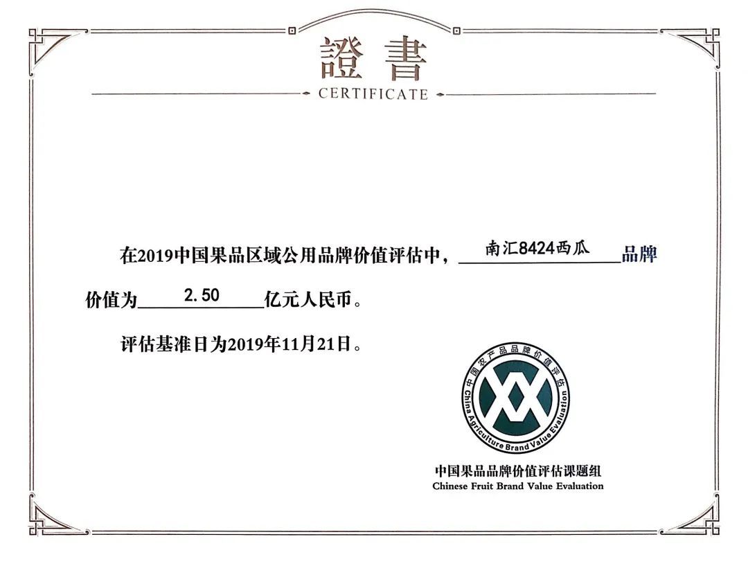2019年,由农协会申报的“南汇8424西瓜”在中国果品区域公用品牌价值榜列第113位,其价值人民币2.5亿元;2019年“南汇8424西瓜”跨入上海市名特优农产品行列。