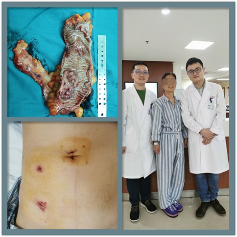 患者周女士,57岁,因“大便带血5天”来同济医院就诊,经术前评估,肿瘤位于乙状结肠距肛门约20cm,大小约2cm,临床分期为cT2N0M0。普通外科徐楷副主任医师和李新星、滕世峰主治医师在普通外科胡志前主任的指导下,成功为该患者实施了三孔NOSES手术。手术历时约2小时,标本大小为20cm×4cm,经肛门取出,出血量仅20ml,患者术后7天出院,腹部仅留下三个小孔,未发生任何并发症。
