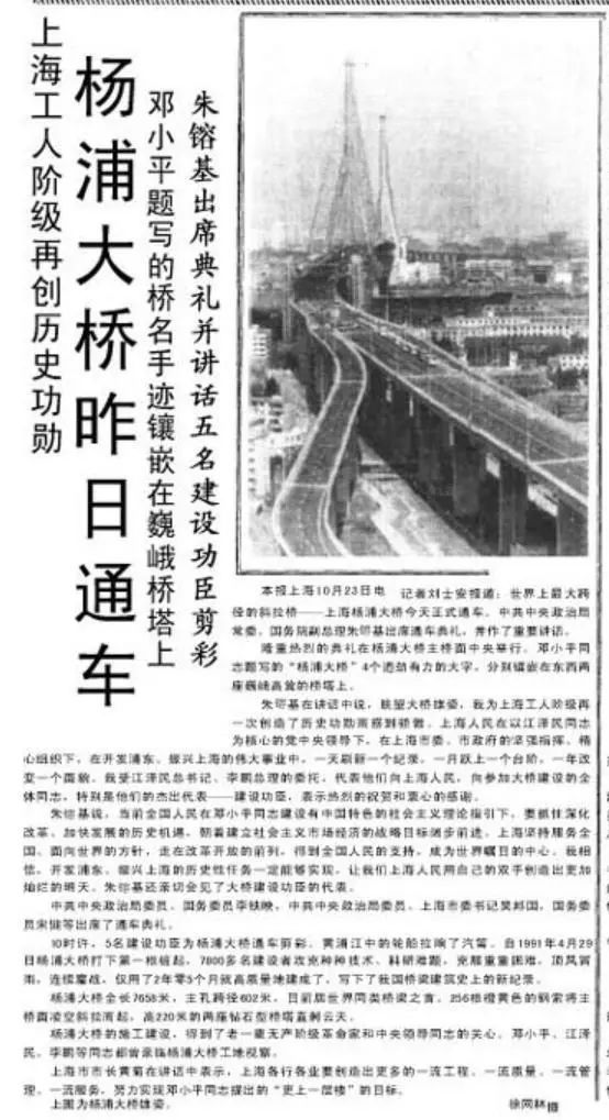 1993年10月24日《人民日报》报道杨浦大桥通车