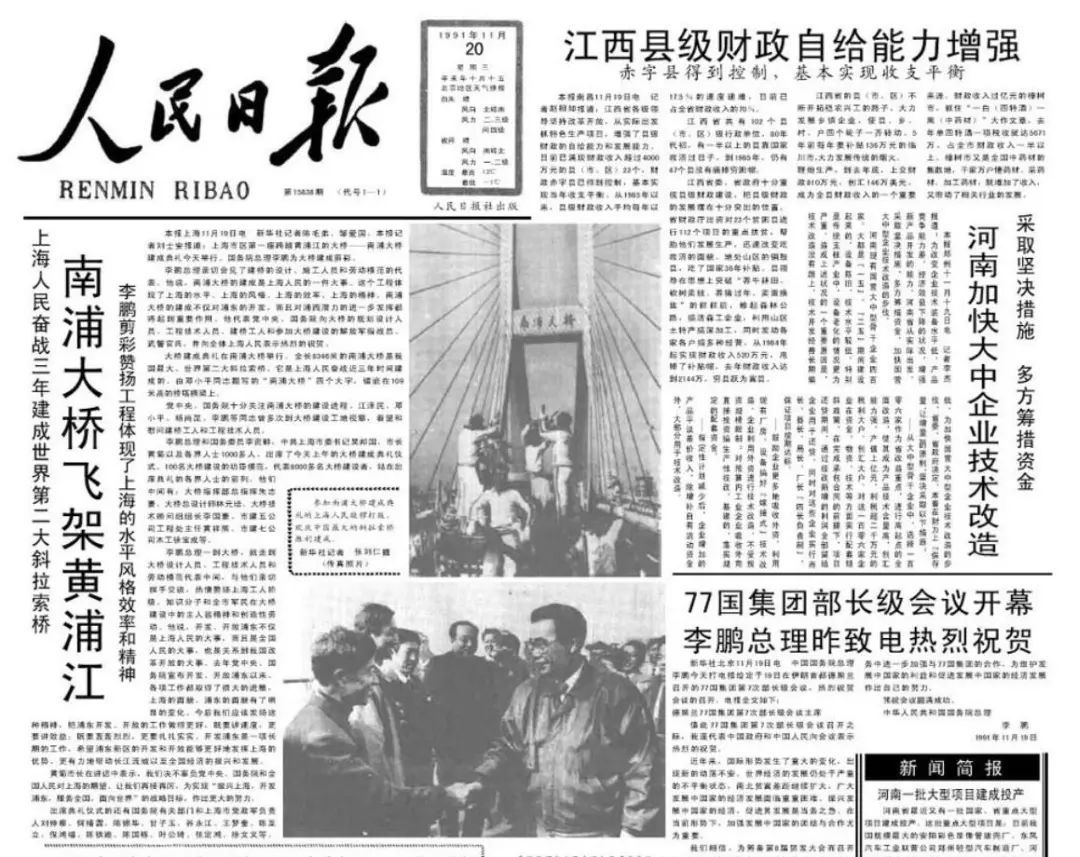 1991年11月20日《人民日报》头版报道南浦大桥建成通车