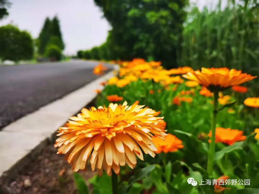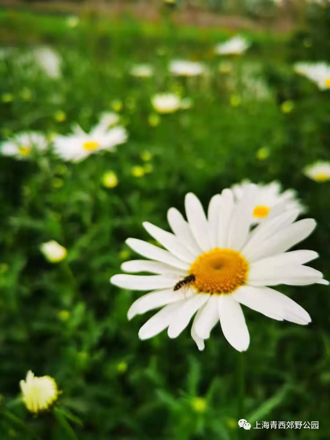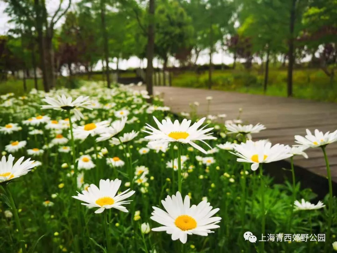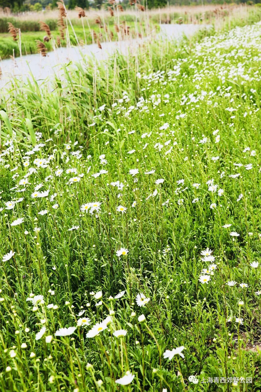 除了金盏菊外,垂钓区木栈道两旁和保育区外成片的大滨菊也绽放啦。蓝天、白云和开满白色花朵的路,给青西增添了一份清新治愈系的美。