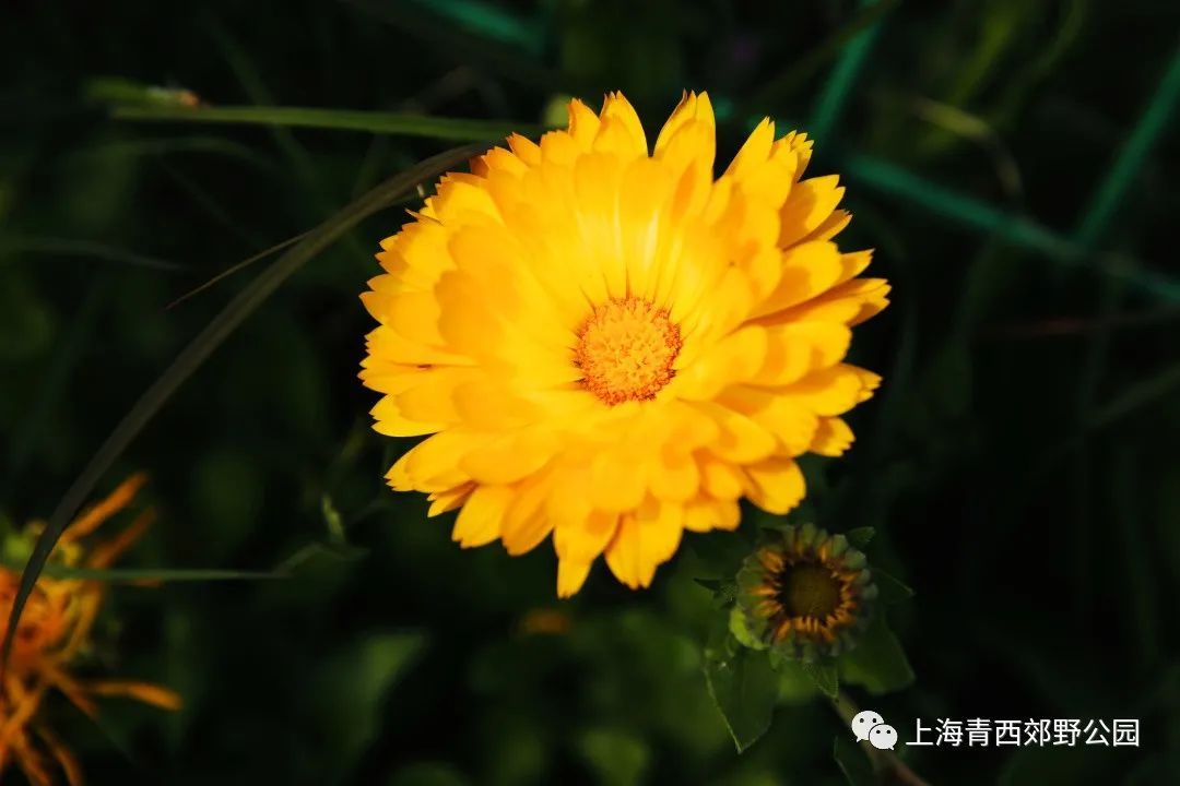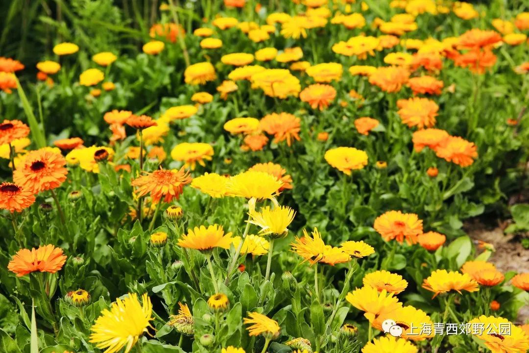 金盏菊的花朵千姿百态:有的花朵含苞欲放,有的花朵才破了一个小小的口子。它们一朵挨着一朵簇拥着,远远望去,像一个个金灿灿的小太阳,那么娇艳,那么活泼可爱。