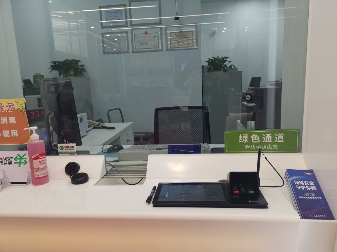 低柜柜台的左边就是高柜柜台,在此客户可以办理任何现金业务;柜台同样设置了绿色通道,为需要照顾的客户提供优先服务;在特殊的时期,柜台上一瓶醒目的免洗洗手液方便客户在办理完现金业务后及时消毒杀菌,给予客户安心放心。