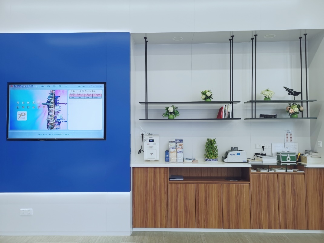 等待区域的旁边设置了便民区域,不但有供老年客户使用的放大镜、老花镜,供盲人客户使用的助盲卡,供客户使用的点钞机和充电线,还有供客户使用的饮水机及医药箱。大堂电视上滚动播放着当日的实时汇率及存款利率等信息,便于客户随时查询了解最新金融资讯。