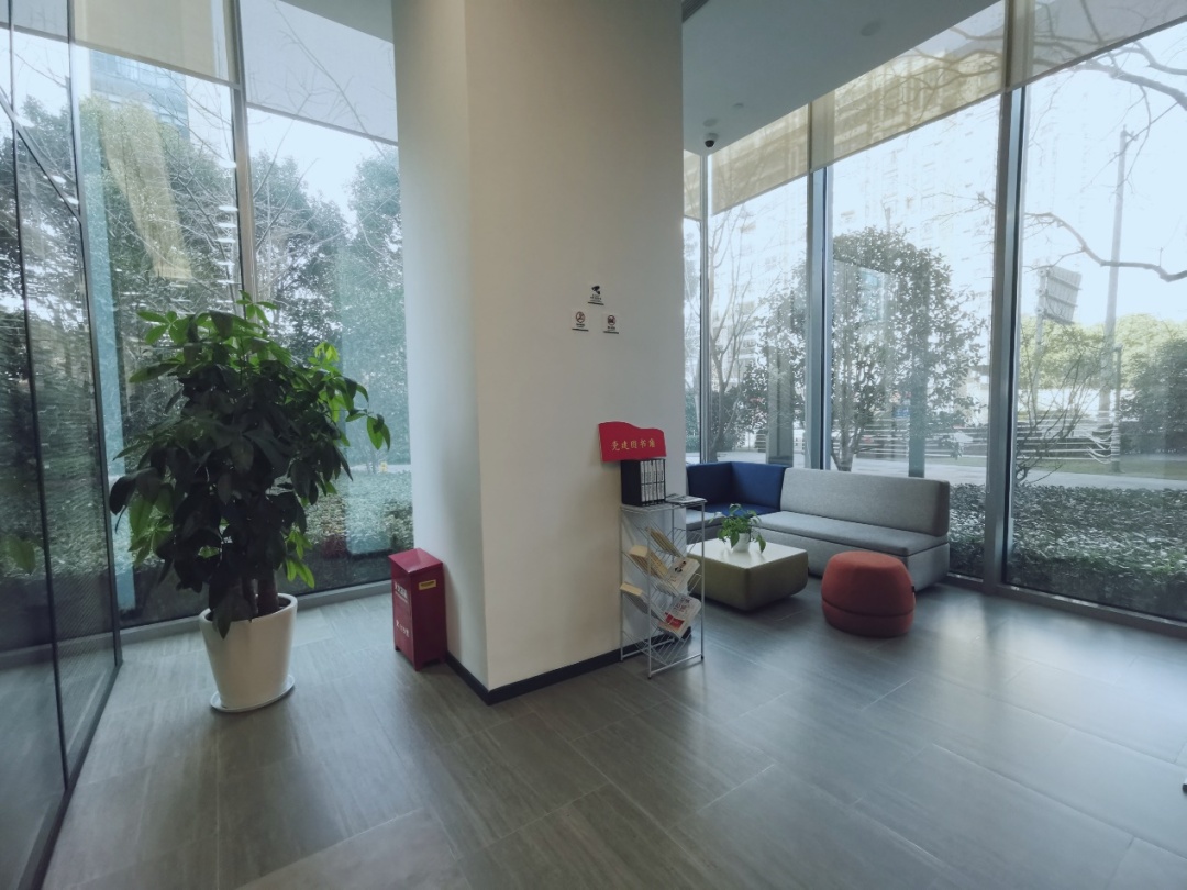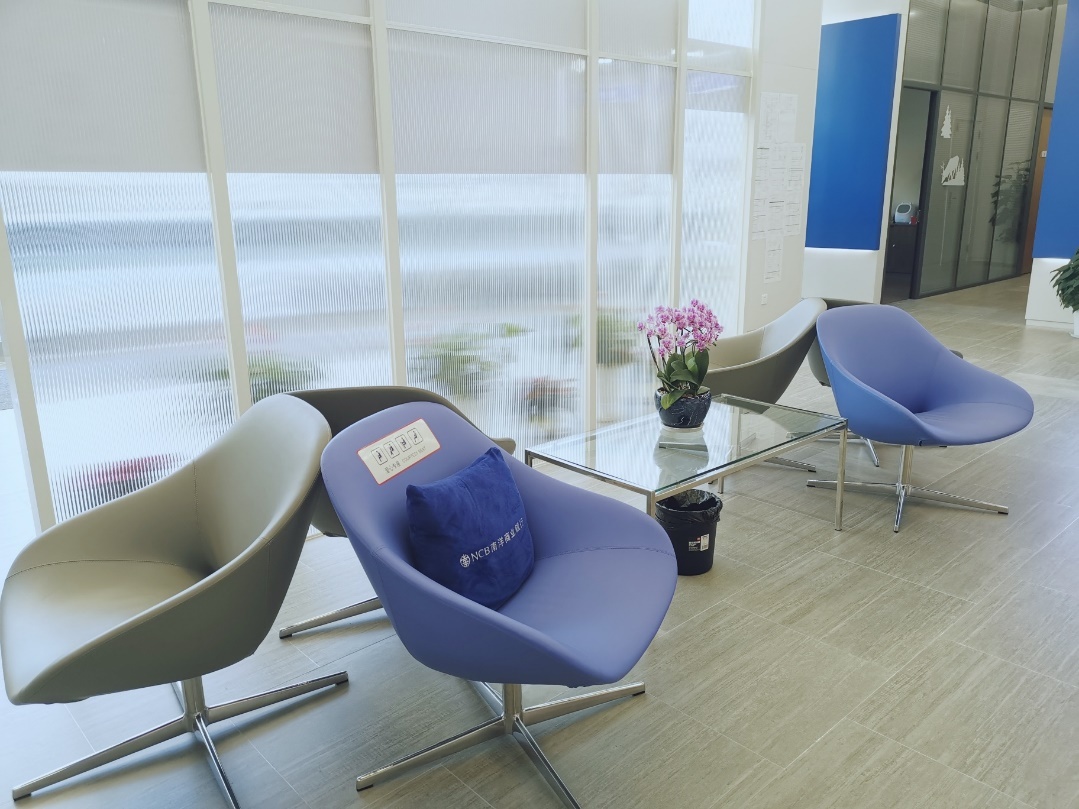 当你走到银行大厅另一角,你会发现这里还有一个供客户休息洽谈的区域,两面硕大的落地窗给客户带来干净舒适的感觉,沙发边放置了读书角,一些最新的书刊报纸供客户休息时阅读;一些绿植的点缀使整个区域生机盎然。