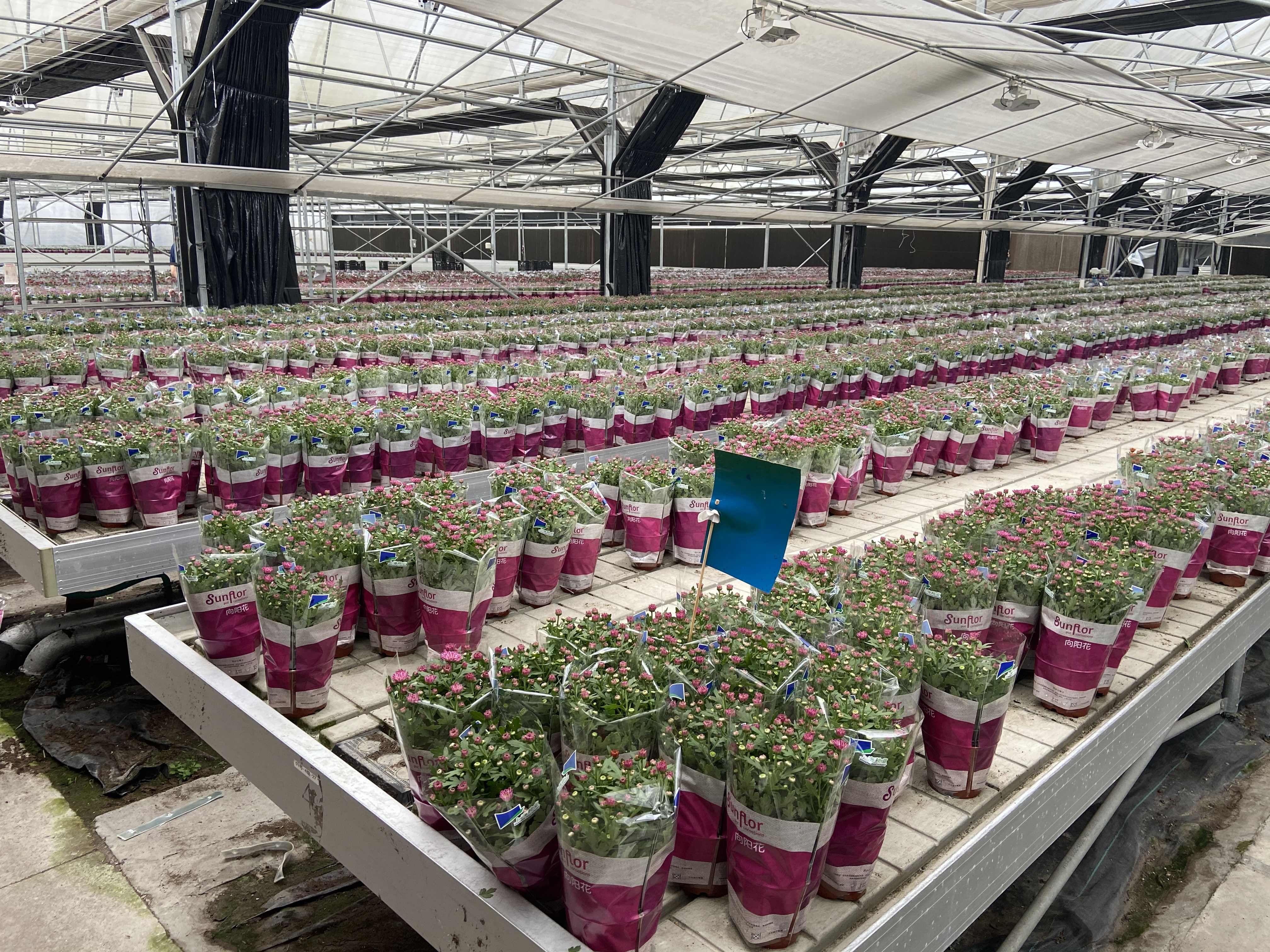 以荷兰菊花为例,由于它是反季节花卉,在培育时需要额外的光照和水肥进行花期调控。为此,温室大棚顶上还安装了植物补光灯和遮光系统,在“人造小太阳”和“人造黑夜”的“精心呵护”下,菊花在5月也能茁壮成长。不仅如此,地下设置的地暖加温系统可以使整个大棚恒湿、恒温,完全满足生长需求。