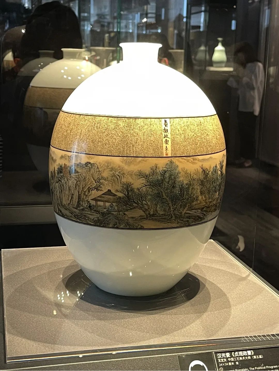 宝库匠心馆馆长叶柏风对这些藏品如数家珍,如上海工艺大师李遊宇创制的汉光瓷,经成百上千次试验,烧成温度高达1400℃,高温烧成后的汉光瓷,白度、透明度和釉面硬度以及柔润度等都大大提高,一系列理化指标,刷新了瓷器纪录。更特别的是,在汉光瓷上面写完了一整部《贞观政要》共计3万6千余字,这种工艺手法由中国工艺美术大师王芝文独创。