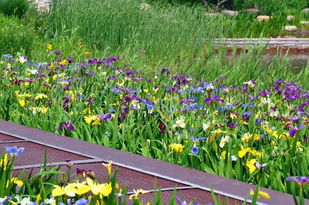 鸢尾作为彩虹湾公园的特色植物,园内种植鸢尾面积约1000平方米,主要品种为德国鸢尾以及路易斯安娜鸢尾。德国鸢尾的花色艳丽,花型优雅高贵;路易斯安娜鸢尾的颜色、形状善于变化,在群花之中显得尤为引人注目。一个花茎上开数朵大而美丽的花,给人威严、华丽之感。如蕾丝边卷曲的花瓣也是它的一大特色。