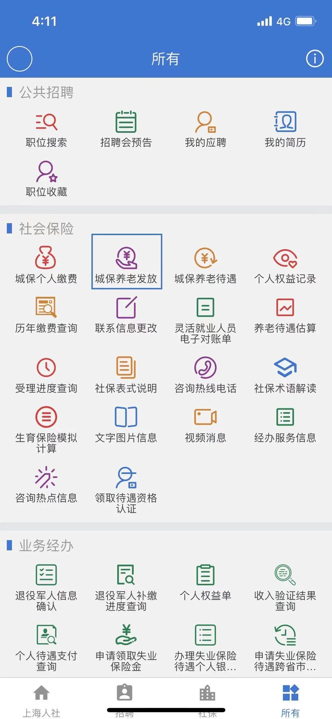 选择页面右下角“所有”模块—在“社会保险”栏目内点击“城保养老发放”。