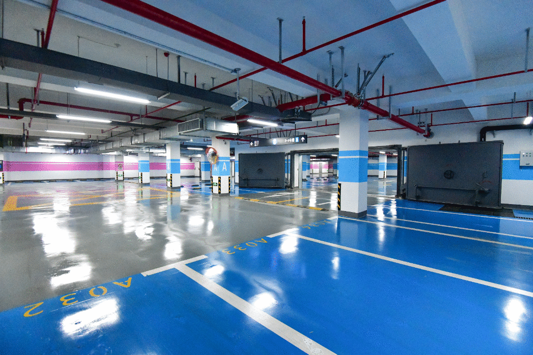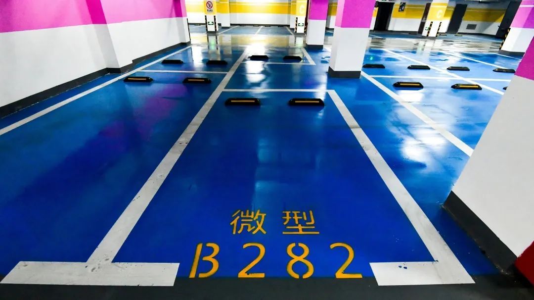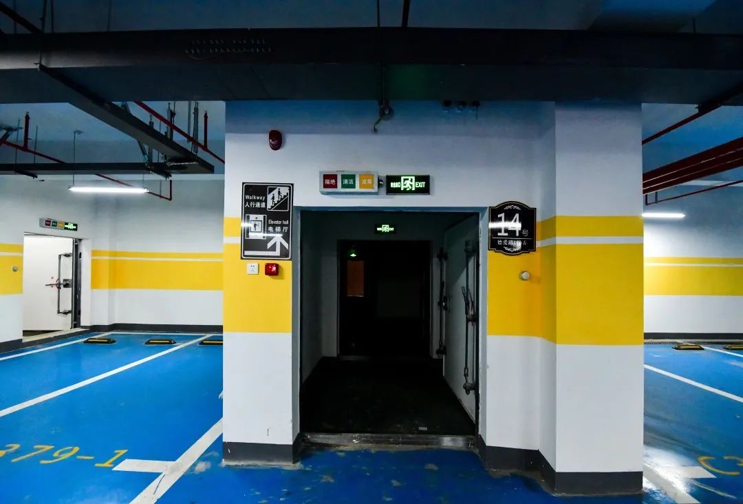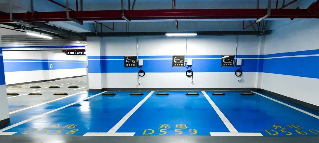 车库二层的机动车停车库堪比大商场和甲级写字楼,宽敞明亮的车库四通八达。据了解,该地下车库有913个车位,分为ABCDE五个区域,每个区域粉刷不同的颜色,辅助以电子指示牌,方便居民寻找车位;地面做了塑胶等防水、防滑处理。913个停车位中,目前有120个共享充电桩车位(后期根据实际需求加配),物业通过充电桩电压监测告警并发送短消息,可以自动通知车主已完成充电。