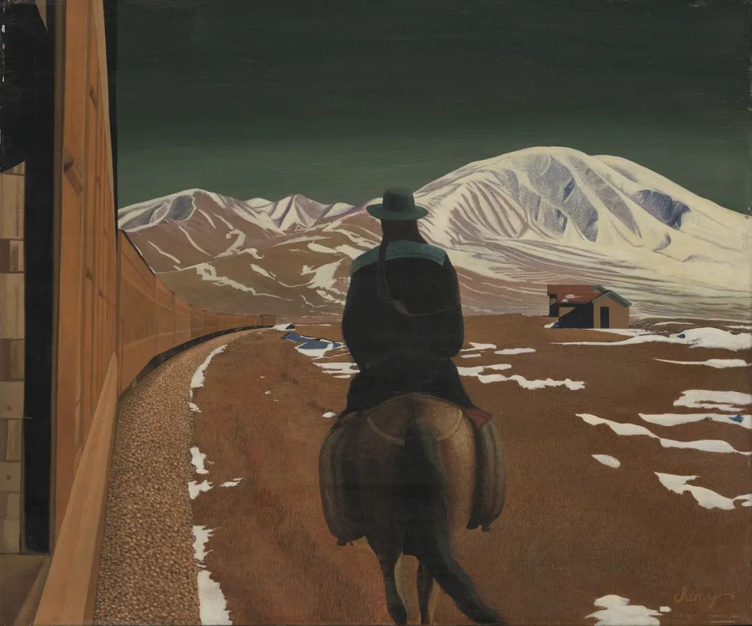 这幅作品曾获第七届全国美展银奖。陈逸青出生于青海,这幅作品刻画了一个骑马的背影,画面左侧驶向远方的火车,构成了一个令人遐想的空间。在深绿色的天空的映衬下,远处山峦上的残雪以及画面右侧的小屋增强了画面寂静空灵的气氛,天地间除了这个骑马人不见人迹,这个骑马的背影和这辆远行的列车让人不由去思考那个永恒的哲学问题:我是谁?我从哪儿来?要到那里去?