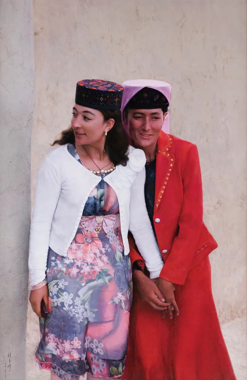 远在祖国最西部的帕米尔高原上塔吉克新娘要出嫁了,她身着红衣羞涩地和闺蜜窃窃私语,等待着新郎的迎亲队伍。她们手里拿着的手机透露着信息时代生活的巨大变化。艺术家以高超的写实技巧,笔触细腻,生动刻画人物的神情及动态,新娘羞怯、喜悦、期盼之情跃然而出。