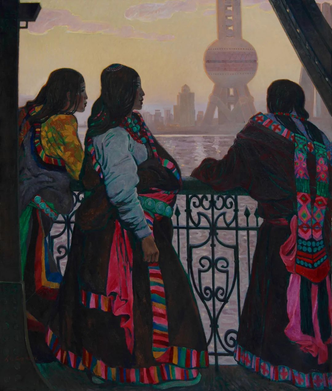 浦江畔三位盛装的藏族妇女凭栏远望对岸的东方明珠,她们如剪影般的身影敦实厚重,暗色的皮袄和彩色的装饰使画面层次格外丰富,而远处隐现着的标志性建筑物,提示了她们身处在繁华都市,给观众留下了更多的想象空间。