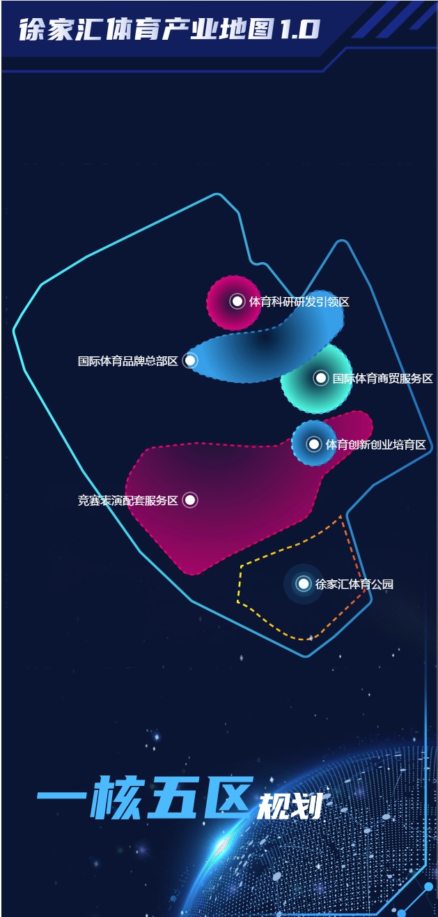 2020年8月,徐汇区作为全国首批、上海首家国家体育产业示范基地,发布了全新的《徐汇体育产业政策》,第一版《徐家汇体育产业地图》也同期发布,这也是上海首个街道级别的体育产业地图。地图围绕构筑徐家汇体育产业“一核五区”空间布局,力争在“十四五”期间形成竞赛表演国内领先、体育品牌总部汇聚、体育科技快速发展、创新创业活力突出、健身休闲品质优良、商旅文体融合发展的产业格局。