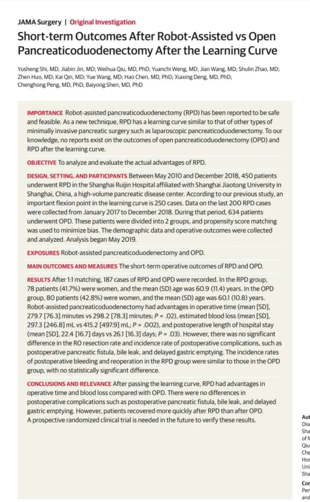 在外科“机器人”时代,争议依然存在。胰腺手术,机器人能否胜任?胰腺癌预后差,机器人手术究竟有必要吗?历经10年的大样本临床对比,去年3月,沈柏用团队在国外科学顶级期刊《美国医学会杂志外科学》在线发表机器人胰腺手术的最新研究成果,证实机器人手术能为患者带来更优的短期疗效——术中出血更少、手术时间更短、术后住院时间缩短、疼痛减轻、恢复进食更快等。