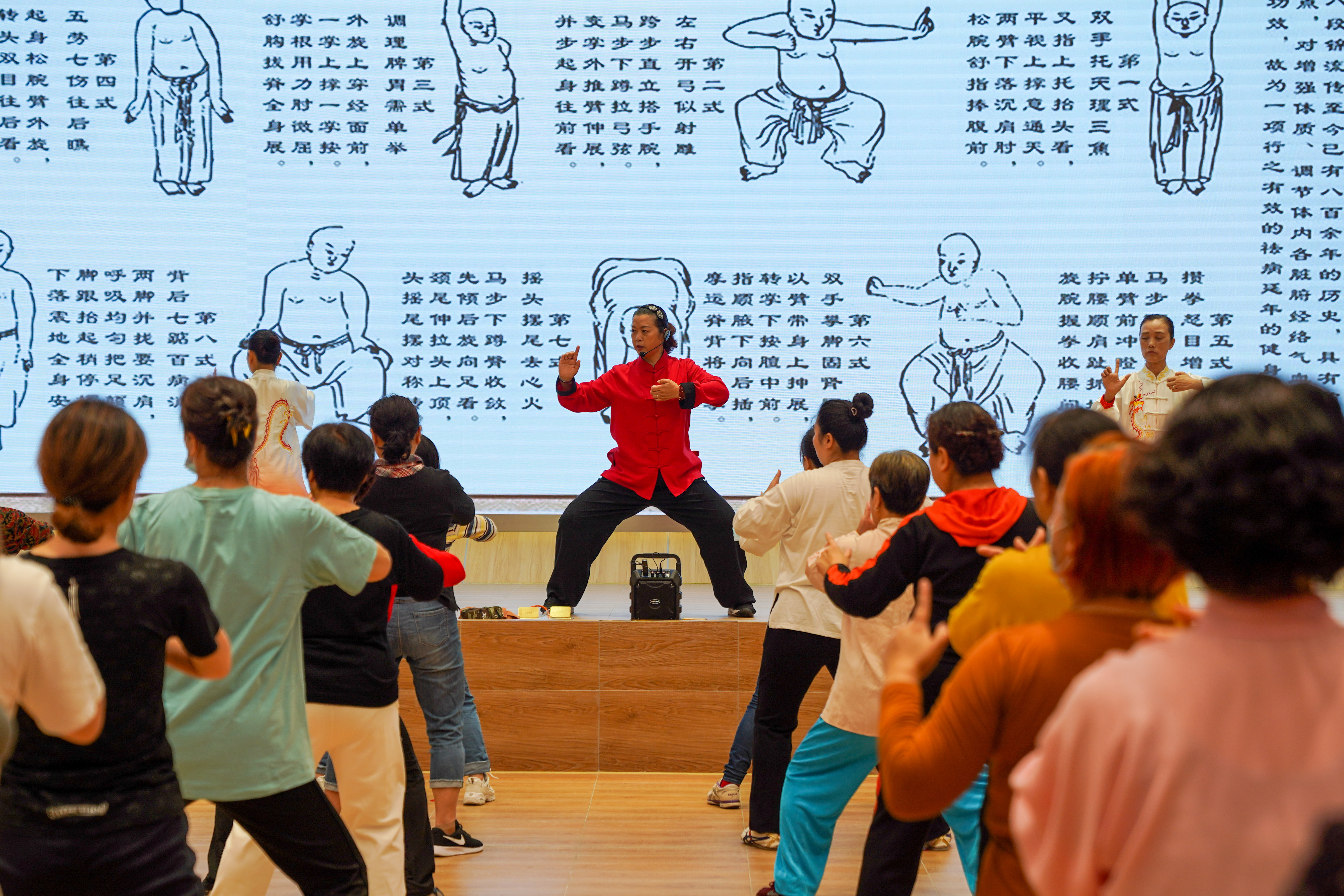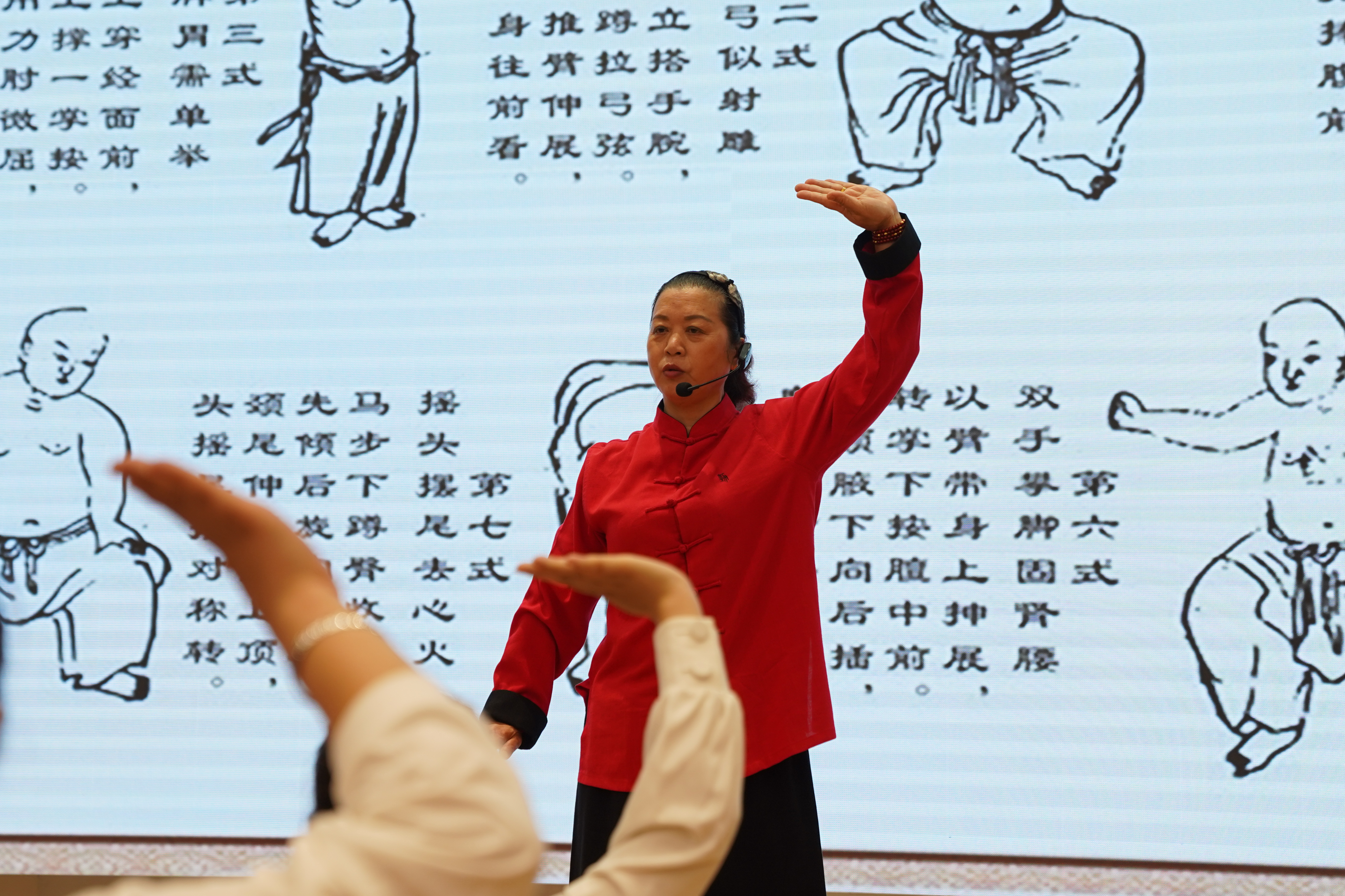 “姿势自然放松,随着呼吸集中意念于一点。”现场特邀国家级社会体育指导员、国家健身气功一级裁判及武术五段导师李静指导大家做起式前的气息准备,让呼吸逐渐归于平缓。几分钟后,第一式开始,只见李静缓慢打出一个动作,台下的青年人群、老年居民纷纷跟着她模仿起来,“第一式要注意叉指上托抬头看”,此刻大家动作一致,除了背景音乐无一丝杂响,百人百面形成一道漂亮和谐的景观。气功看似是“慢动作”,实则蕴含体内的大股力量。