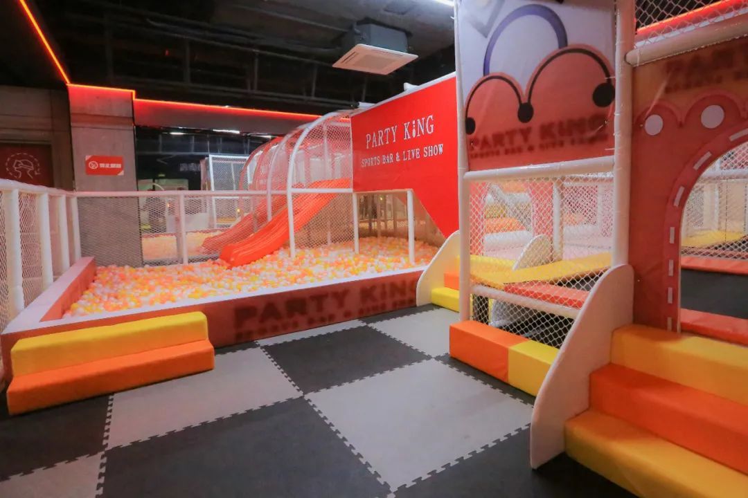 最里侧还有供孩子们蹦蹦跳跳的游乐场。滑梯、海洋球是孩子们的专属快乐,家长们可以坐在儿童区门口的桌椅上放松休闲。