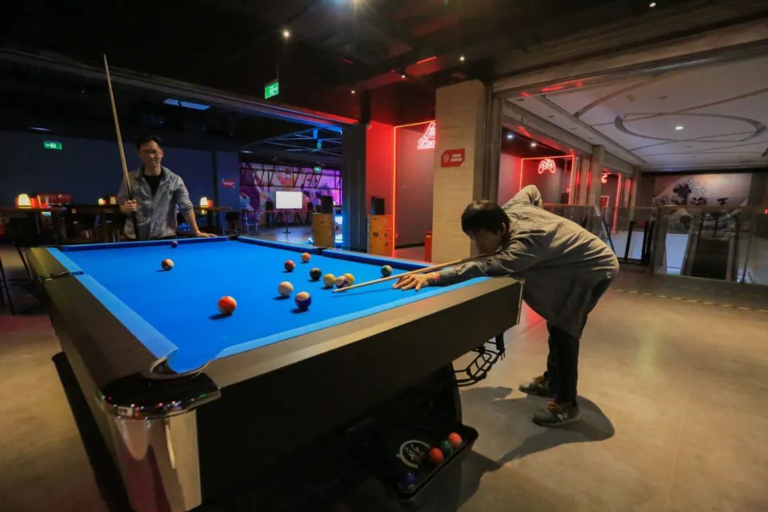 入口即是桌球区。即使是工作日的上午,也来了不少“球友”。还有人一边击球,一边开玩笑:“一杆下去,球进不进不重要,关键是姿势要帅。”