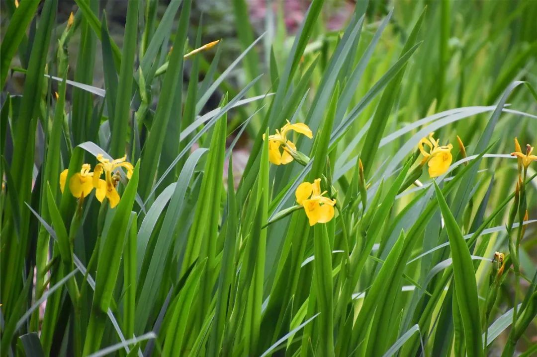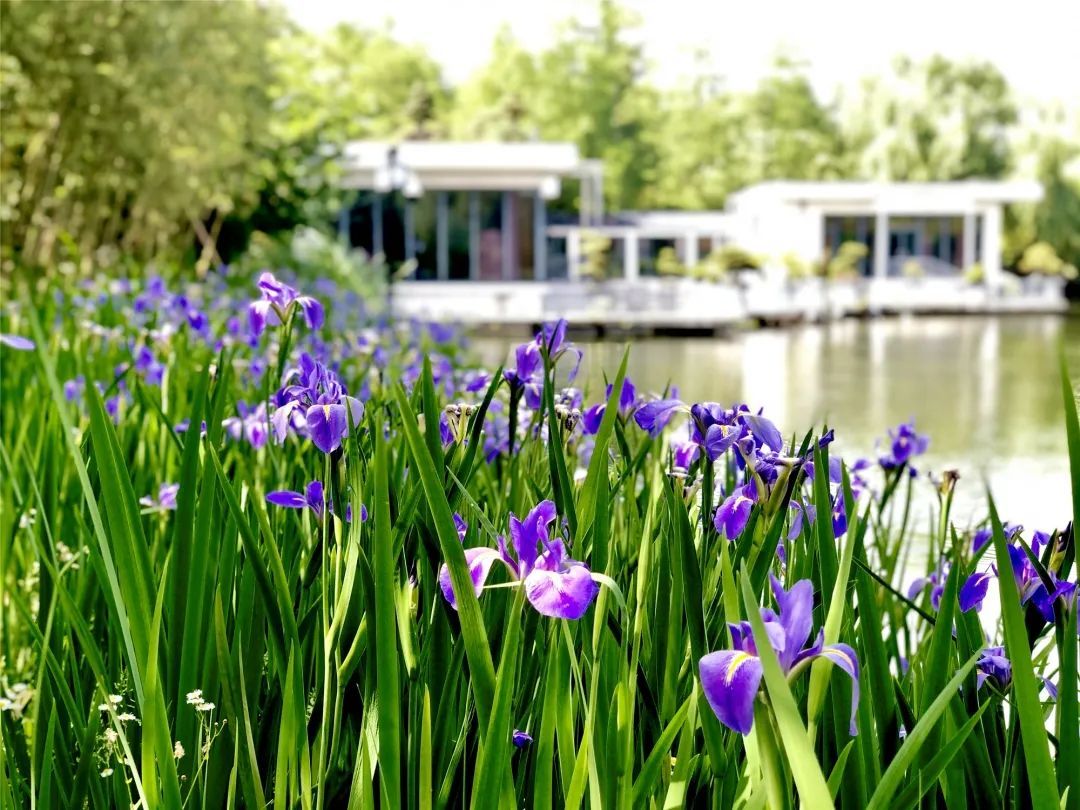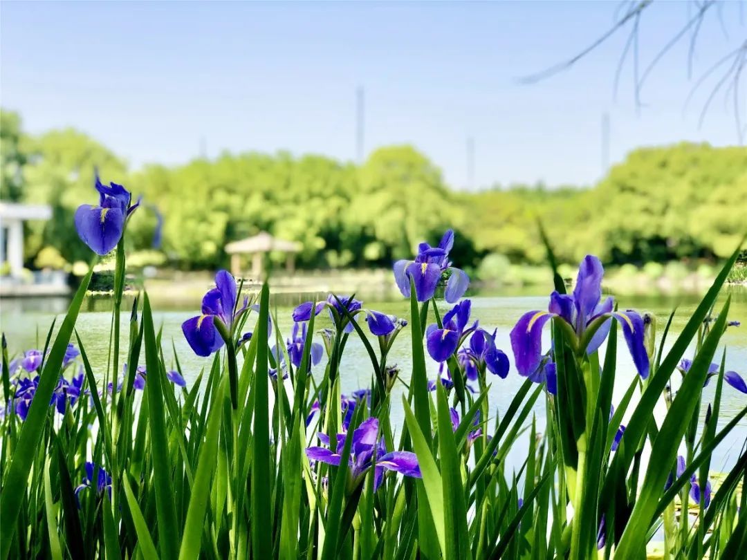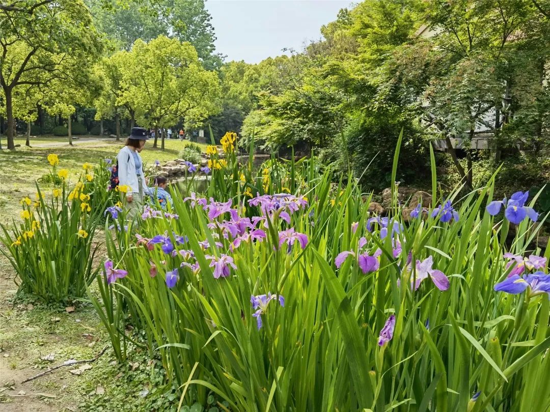 公园内的黄色鸢尾花主要为黄菖蒲品种,颜色丰富且花瓣硕大的主要为路易斯安娜鸢尾,部分蓝色小花的品种为溪荪,大花花菖蒲后续也将陆续开放。