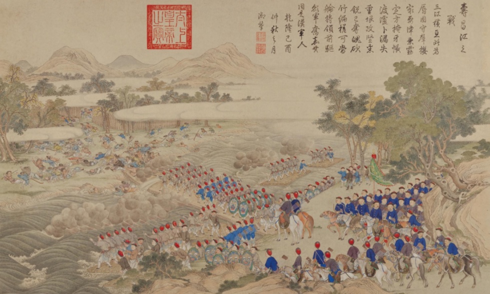 阮光平愿意亲自进京朝贡,清廷自认为最终还是搞定了边陲。据“档案总汇”记,两国谈判后,高宗即开始着人创制《平定安南国战图》,册页六开,以留青史;再在武成殿张挂高一丈二尺八寸,宽一丈二尺六寸,可谓巨幅的绢质《平定安南国战图》对外宣传——乾隆圆满矣。