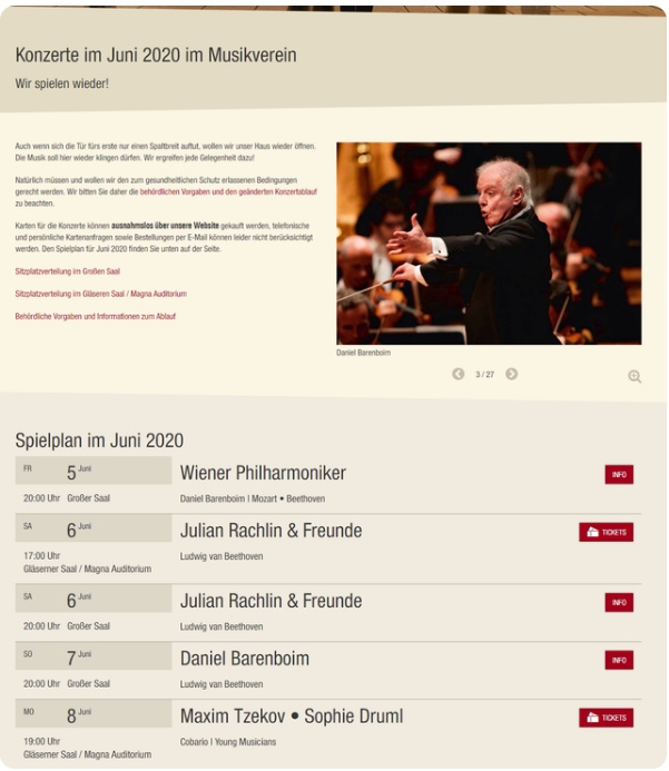 奥地利两大顶级乐团:维也纳爱乐乐团与维也纳交响乐团,著名指挥家巴伦博伊姆、穆蒂、莫斯特、菲利普·乔丹,钢琴巨匠布赫宾德,以及众多知名室内乐团与独奏家等都将重返维也纳金色大厅。