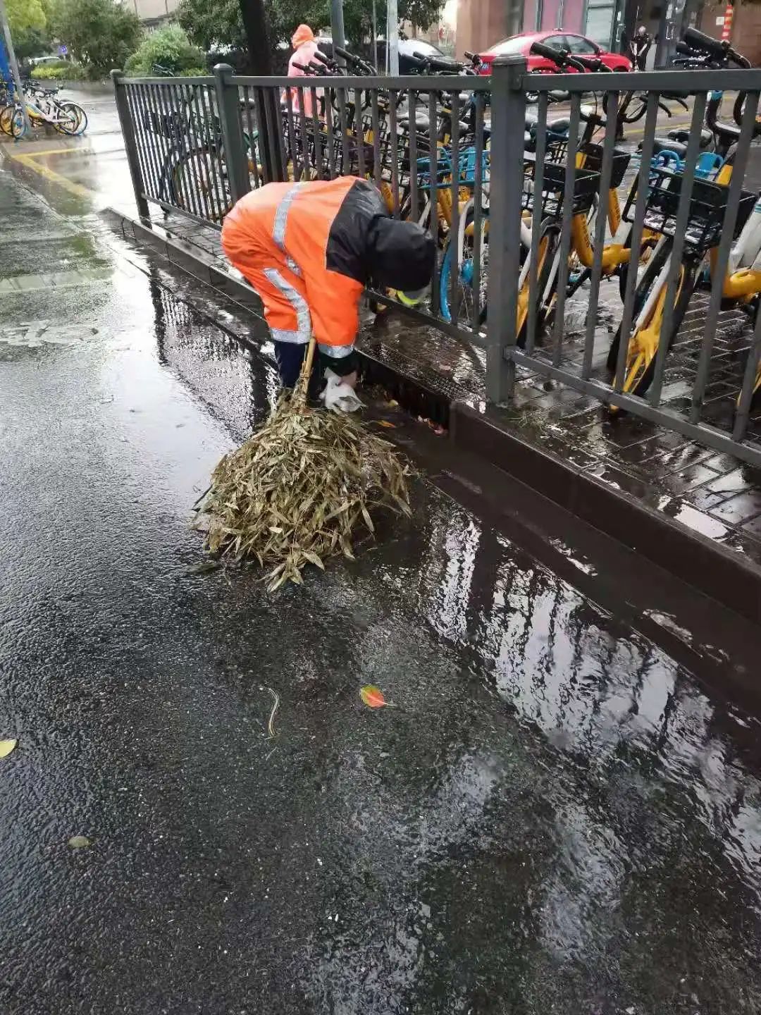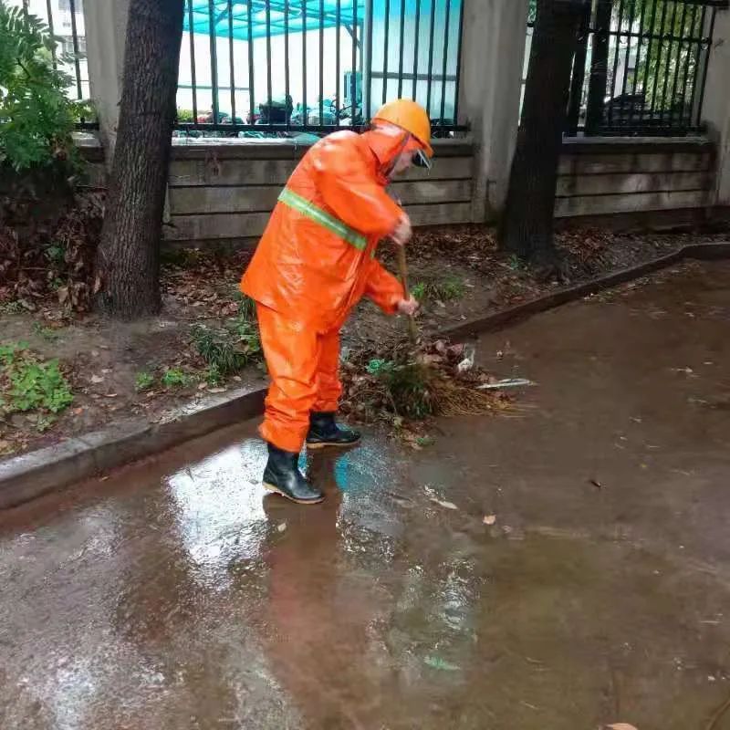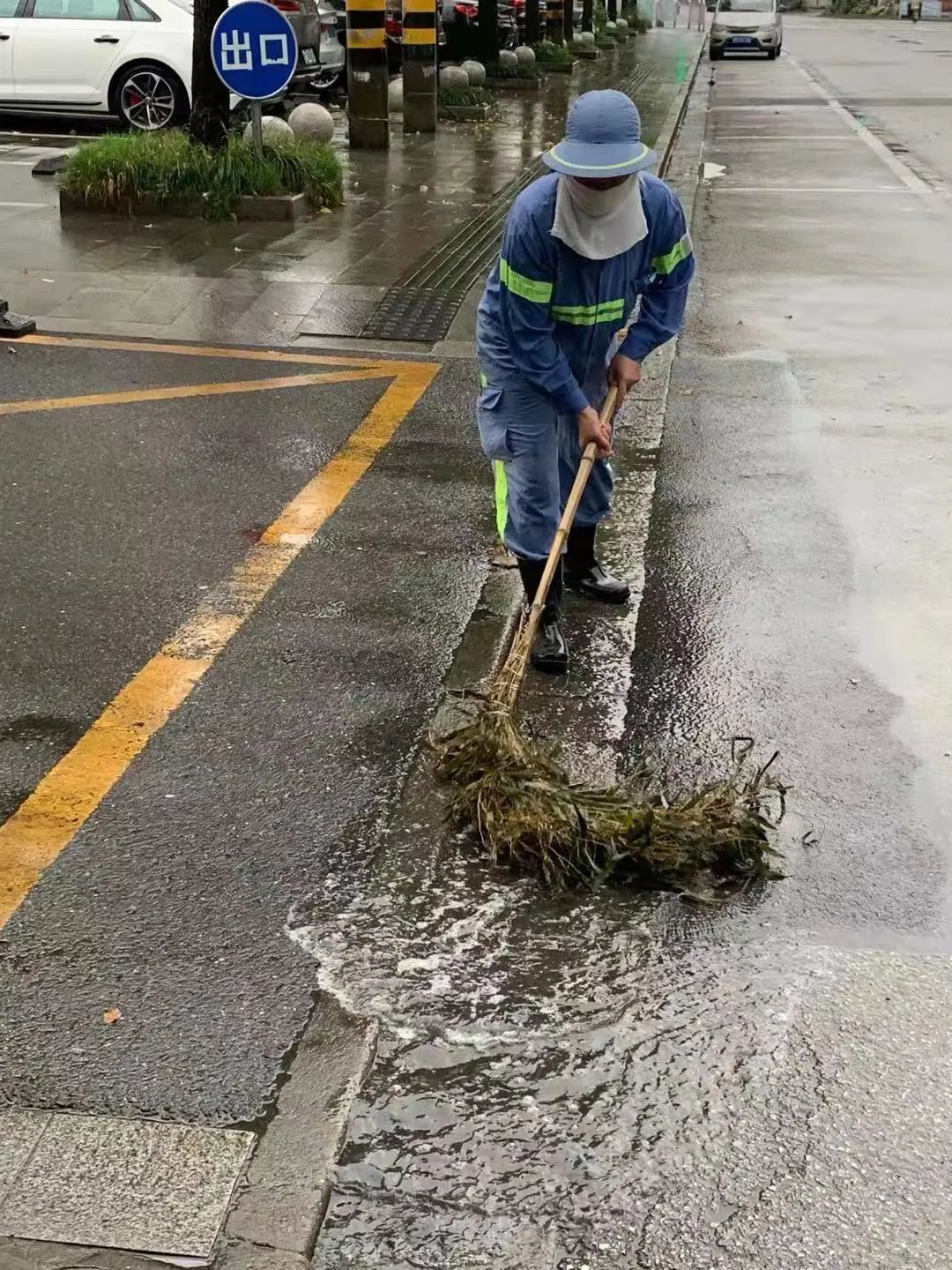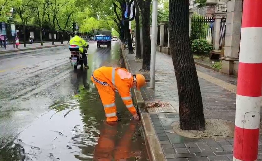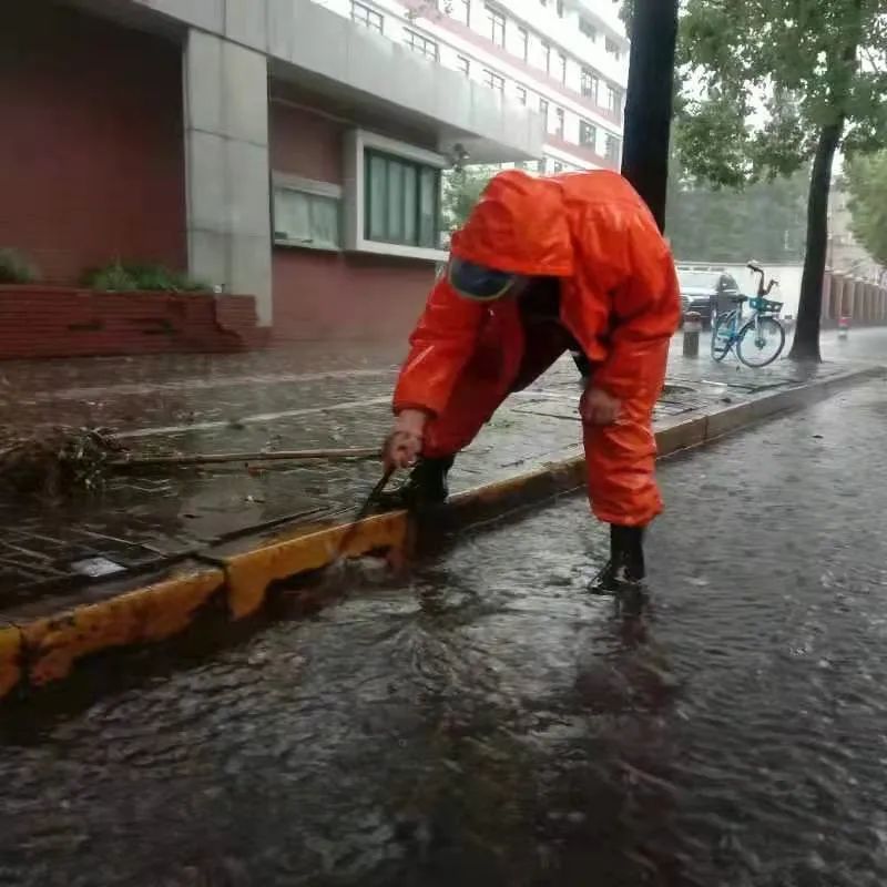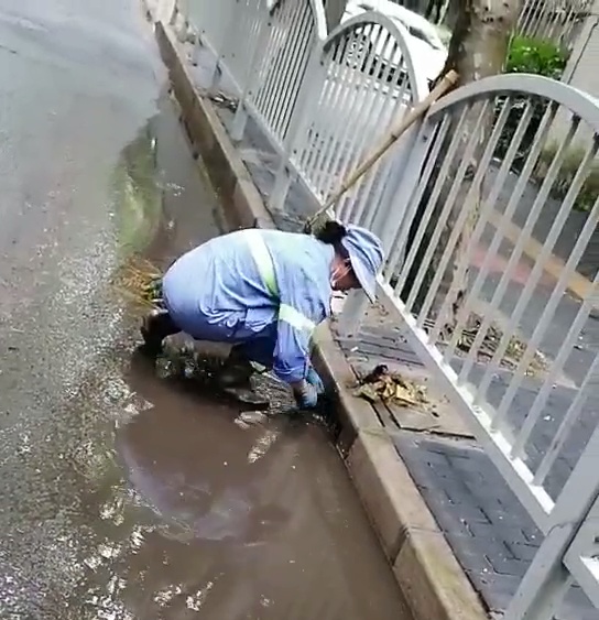 暴雨天气,大量落叶、断枝、碎石伴随雨水涌入下水道,造成窨井口堵塞,环卫工人一一徒手清捞,这每一次弯腰,都是“跨前一步,为民服务”的写照。