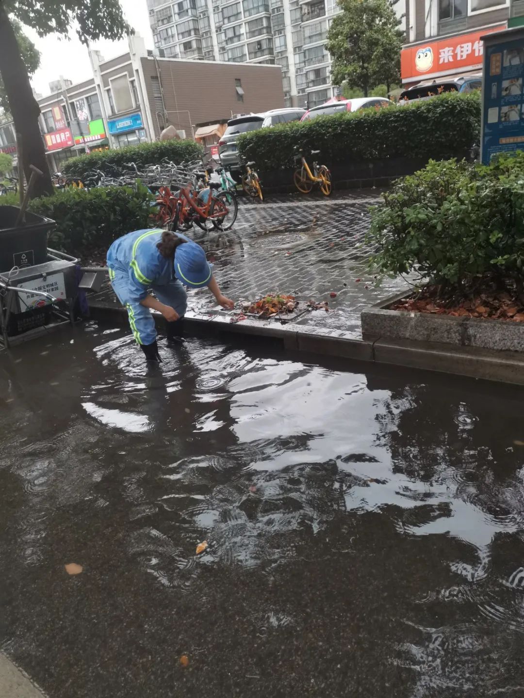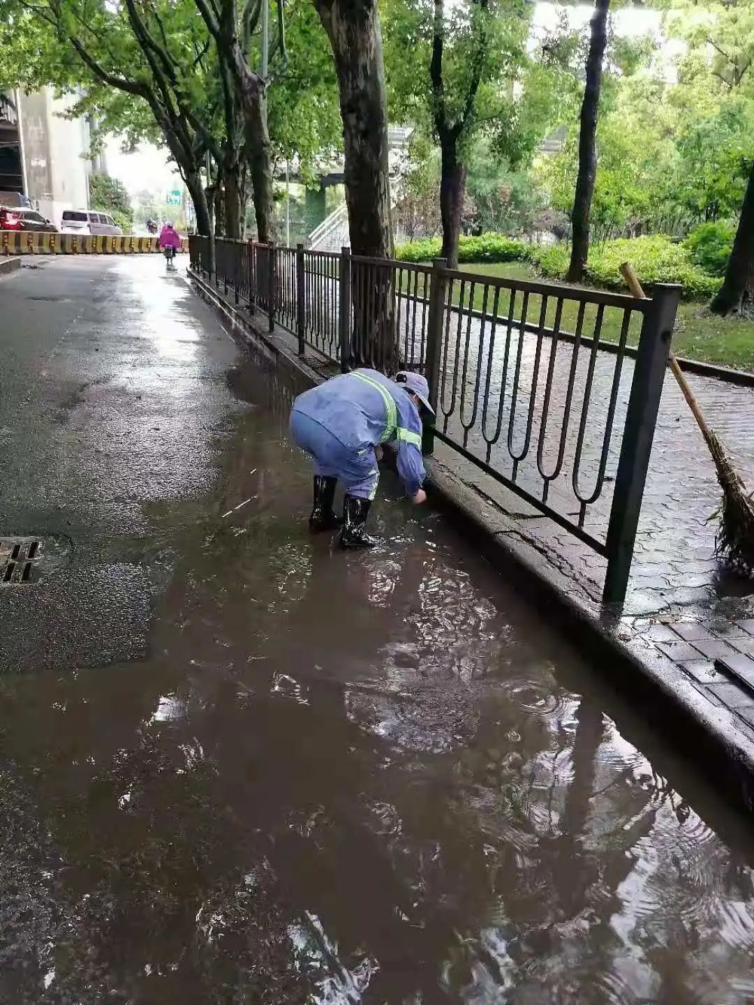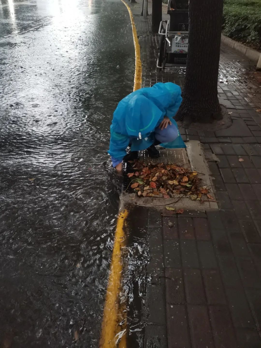 暴雨天气,大量落叶、断枝、碎石伴随雨水涌入下水道,造成窨井口堵塞,环卫工人一一徒手清捞,这每一次弯腰,都是“跨前一步,为民服务”的写照。