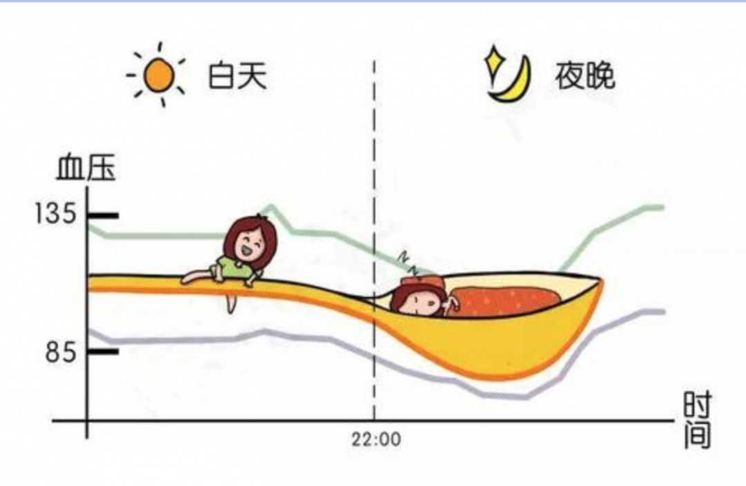 日节律是指昼夜周期节律变化,通常情况下,上午9、10点,下午5、6点是一天里血压最高的两个时段,其它时候稍低,夜间睡眠后较白天降低。