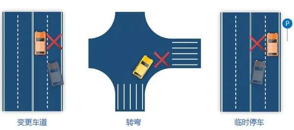 下面的三种情况变更车道、转弯、靠路边停车前必须按照规定使用3秒转向灯,再进行变道。
