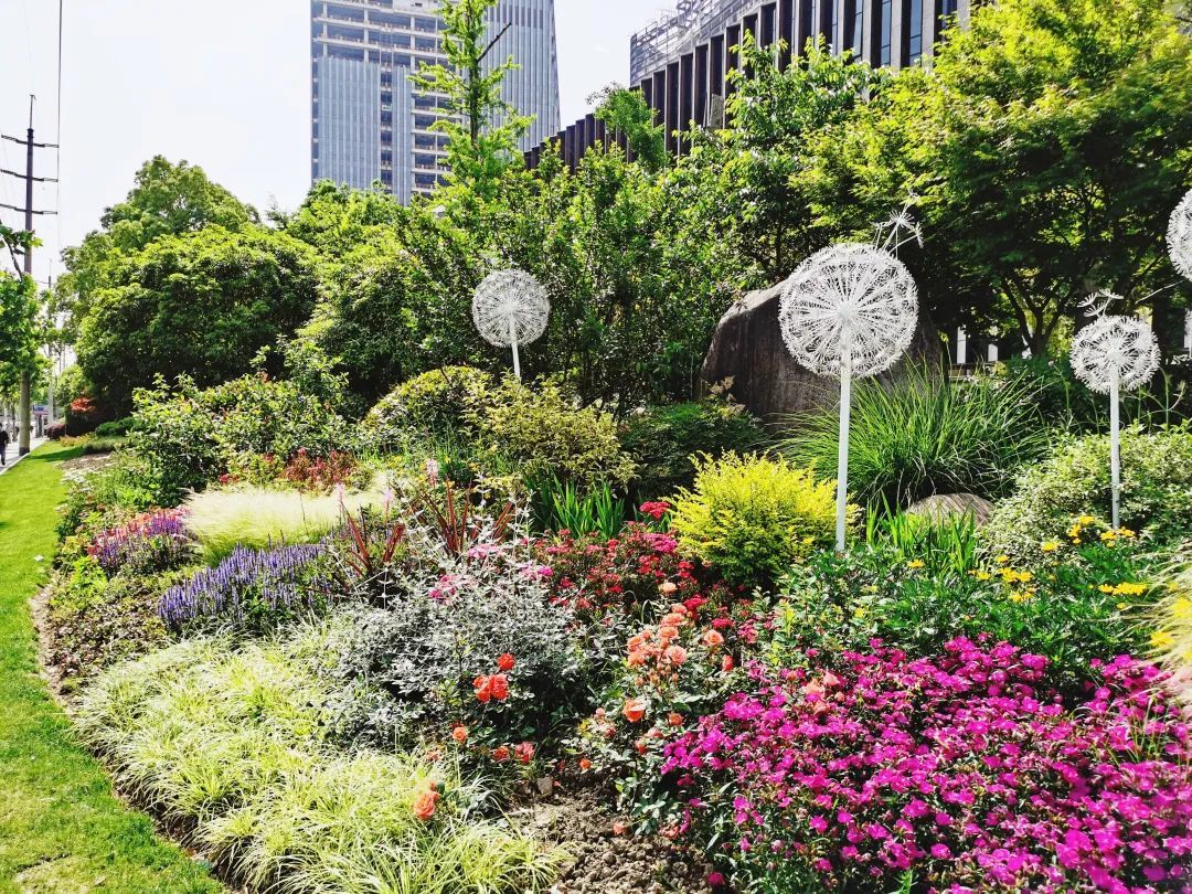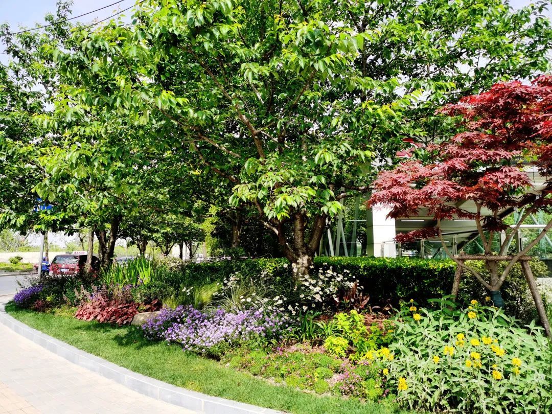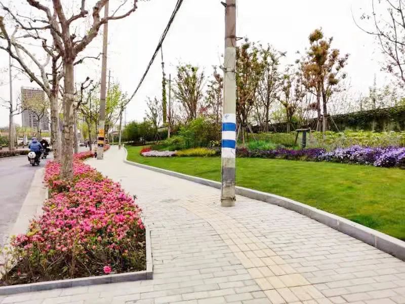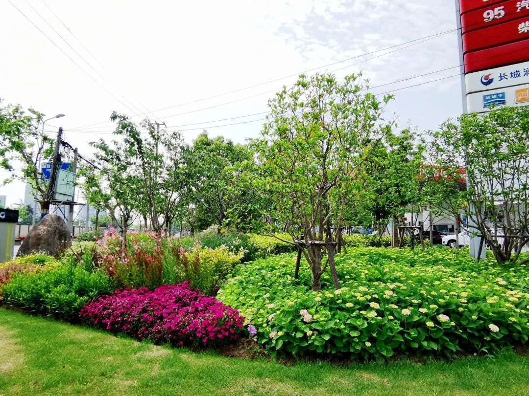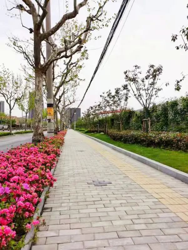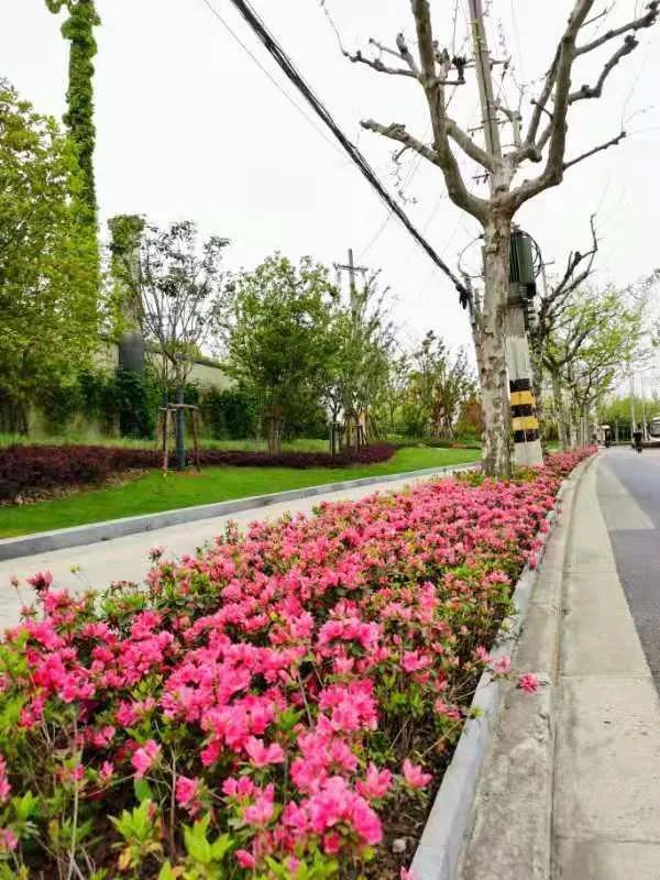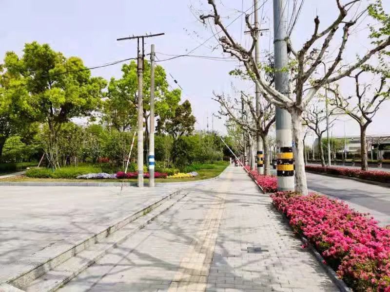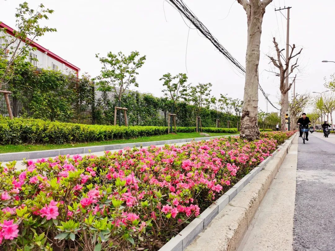 真南路(祁连山路—武威路)是普陀一条有特色的景观道路,在这条路上种植了红叶石楠、春鹃,搭配上天鹅绒紫薇、金桂、晚樱等彩色植物,色彩缤纷,别有一番韵味。垂直绿化带上则种有爬藤月季,待到花开满街,层次错落有致,打造出普陀花团锦簇、锦绣溢彩的景观道路美景。