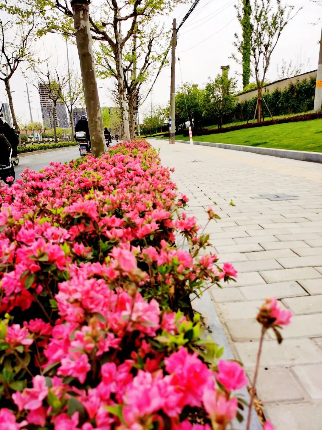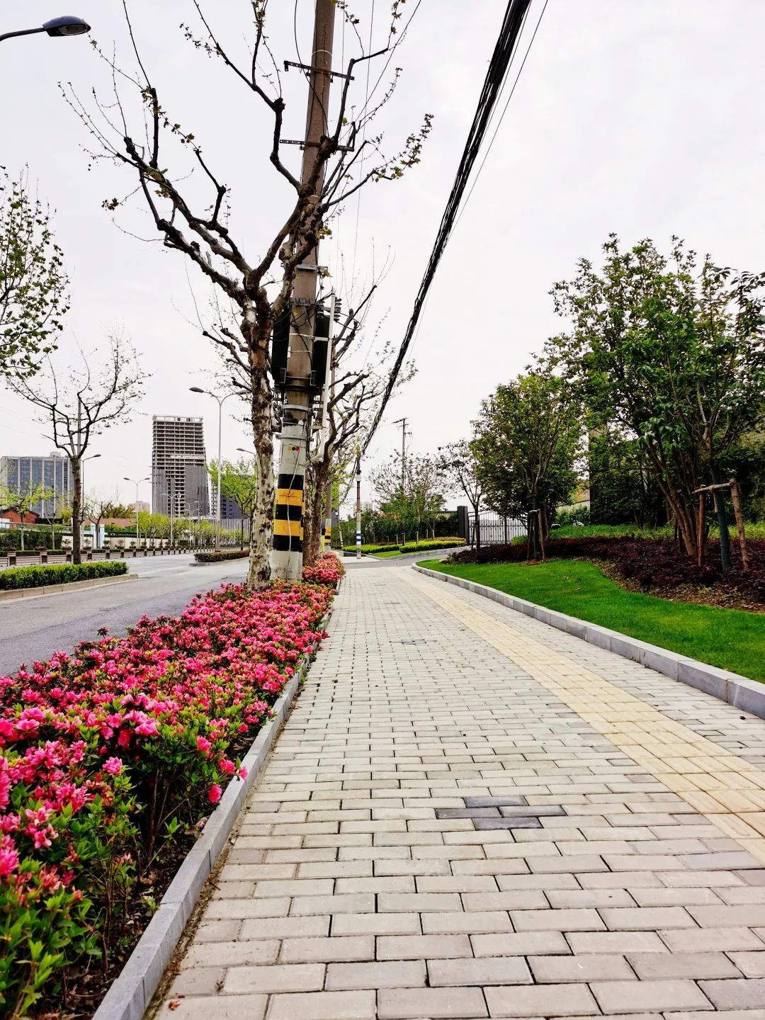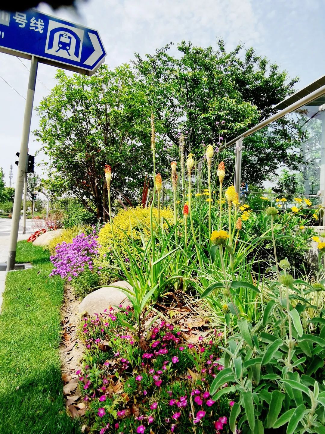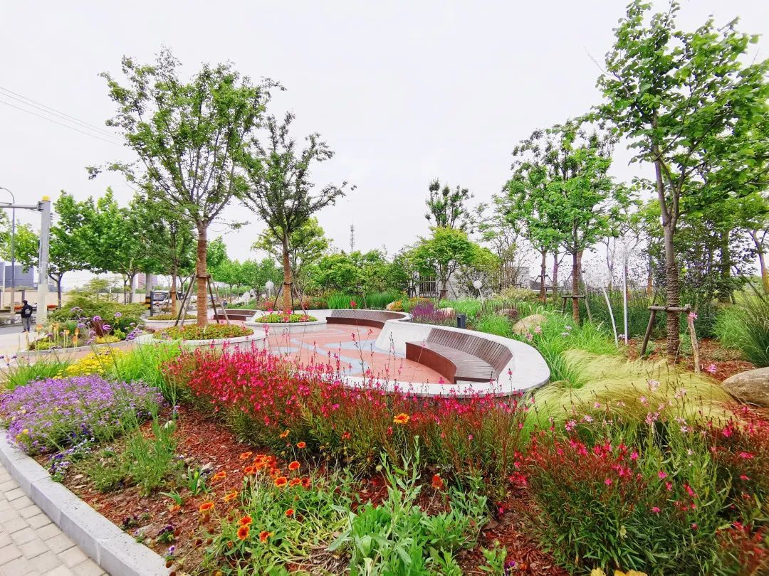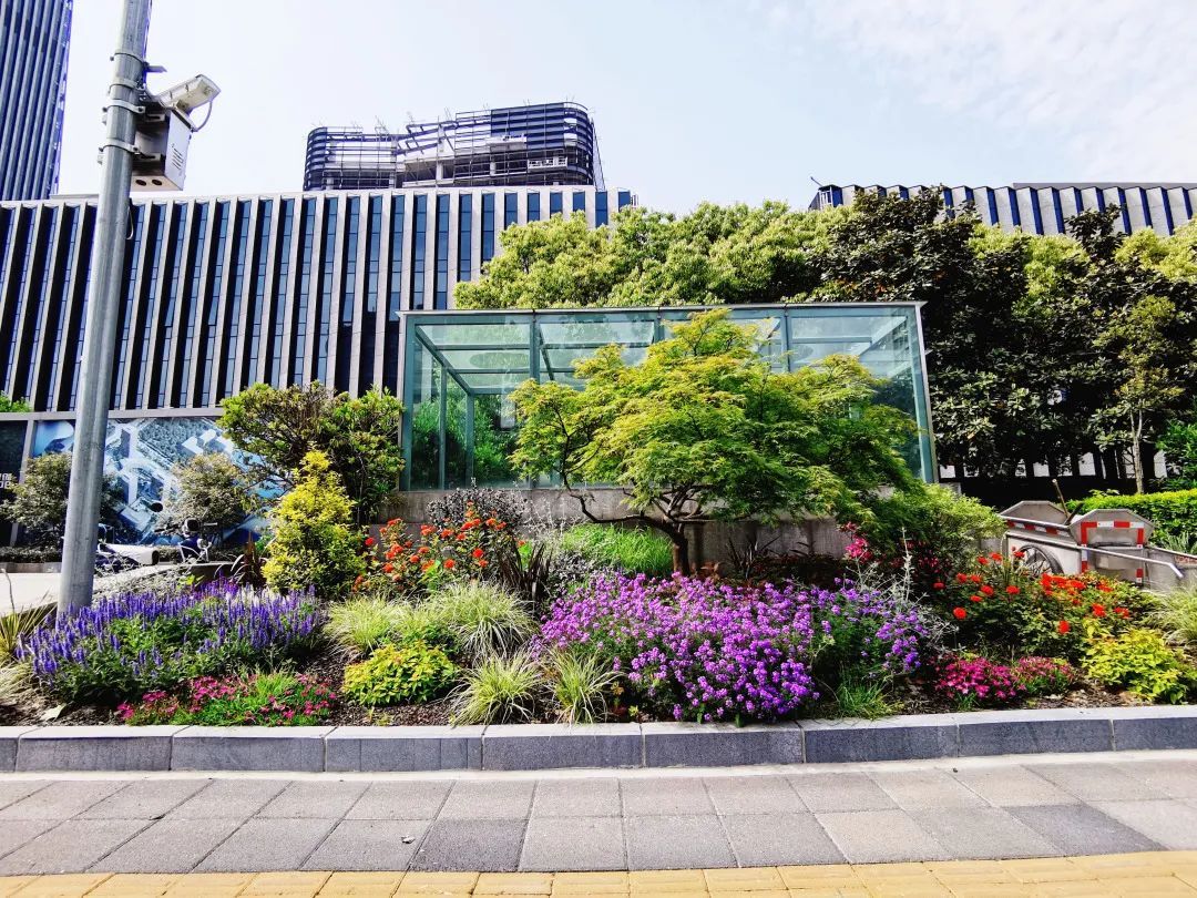 真南路(祁连山路—武威路)是普陀一条有特色的景观道路,在这条路上种植了红叶石楠、春鹃,搭配上天鹅绒紫薇、金桂、晚樱等彩色植物,色彩缤纷,别有一番韵味。垂直绿化带上则种有爬藤月季,待到花开满街,层次错落有致,打造出普陀花团锦簇、锦绣溢彩的景观道路美景。