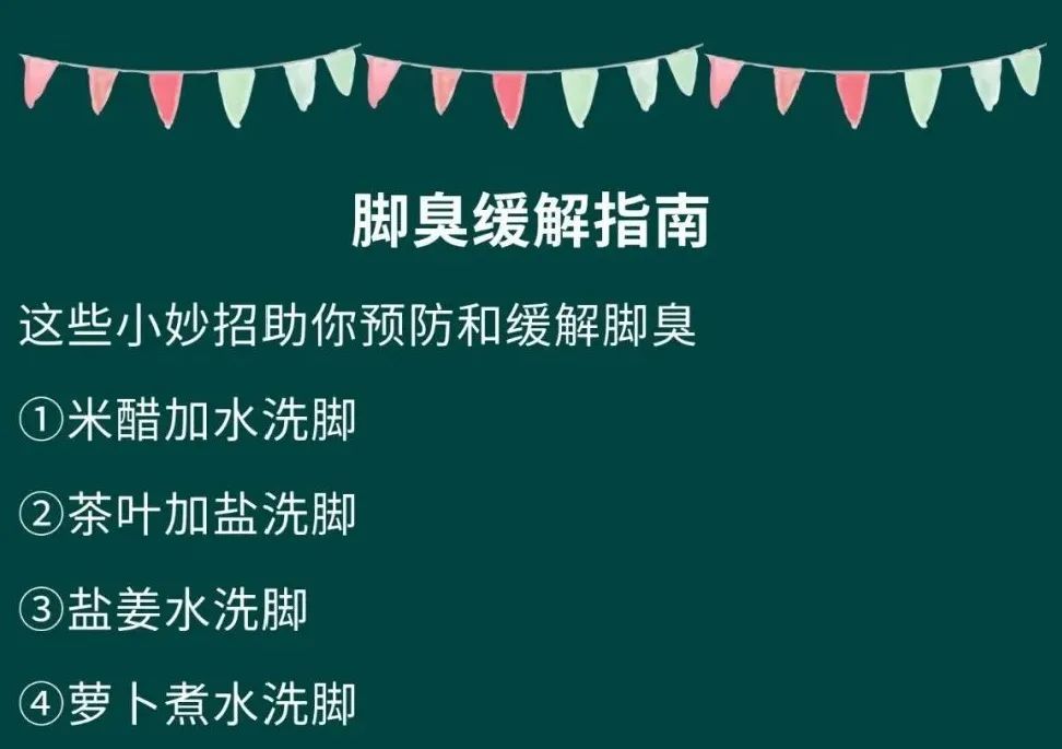 单纯的脚臭,重在清洁。清洁,其实就是努力去除皮肤表面的汗液和细菌。细菌少了,异味自然就消失了。此外,还可以通过一些小妙招来预防和缓解脚臭。