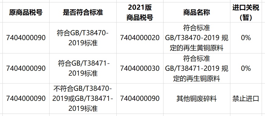 注:已领取2020年铜废碎料限制进口类可用作原料固体废物进口许可证的仍可进口,适用0%进口暂定关税税率。