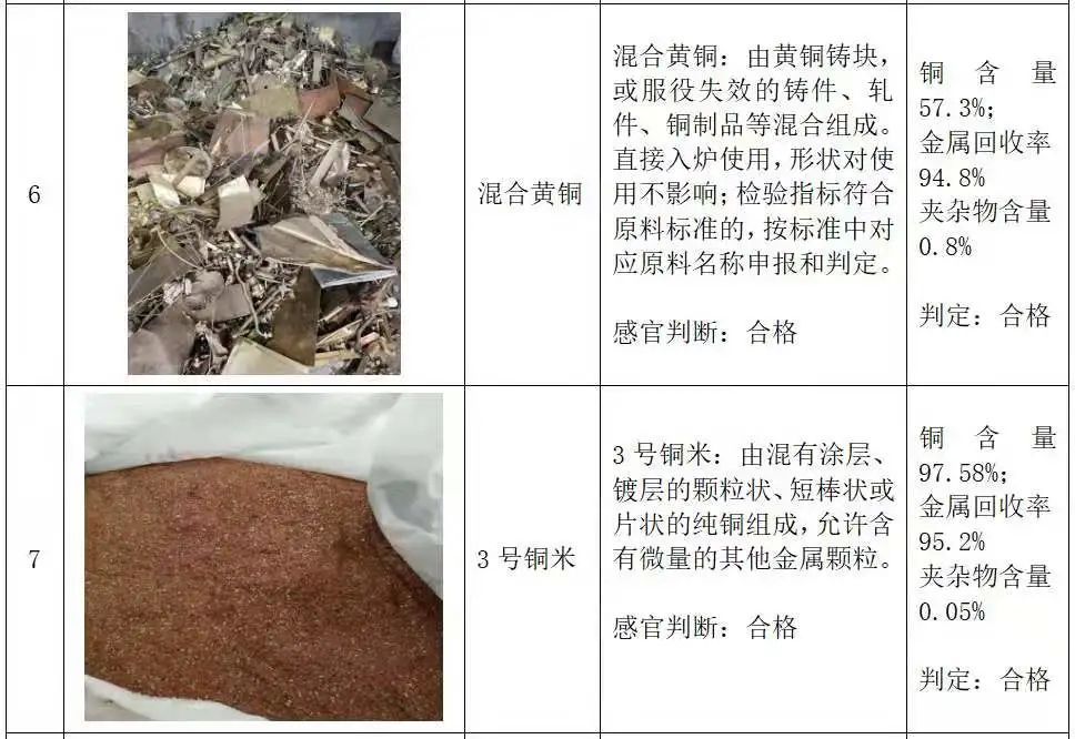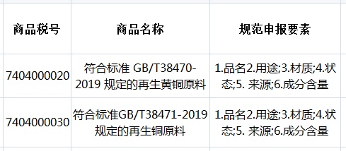 在《再生黄铜原料》(GB/T38470-2019)、《再生铜原料》(GB/T38471-2019)中,对再生黄铜原料、再生铜原料的用途、特征状态、原料来源、金属总含量、铜含量、黄铜含量、回收率、包装等要素分别做出了规定,进口时需对照标准要求如实申报。