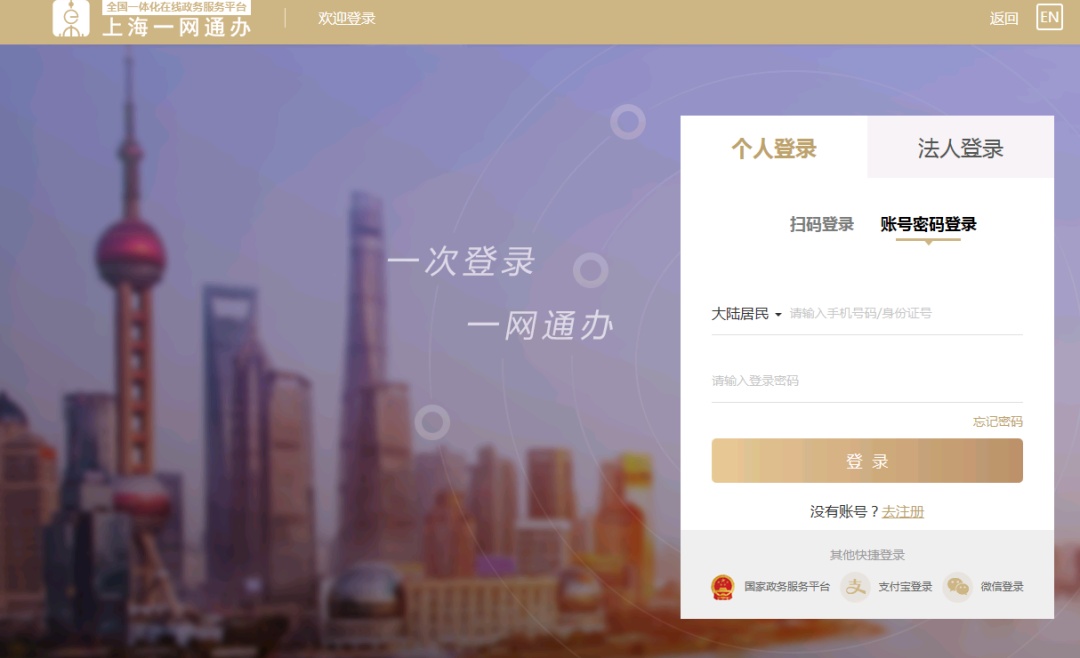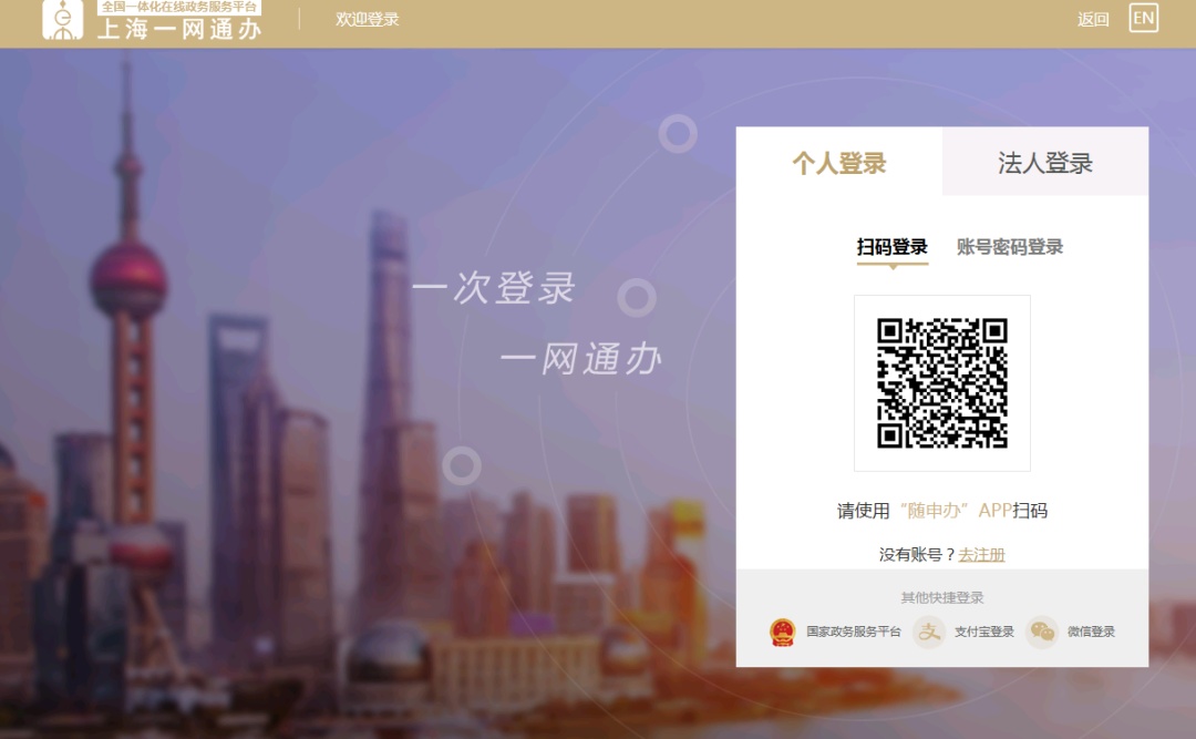 可选择“随申办APP”扫码登录,也可选择账号密码登录(账号密码即随申办的账号密码),同时支持支付宝、微信免注册登录,但支付宝和微信必须进行过实名认证。