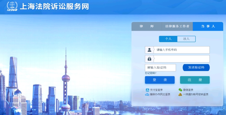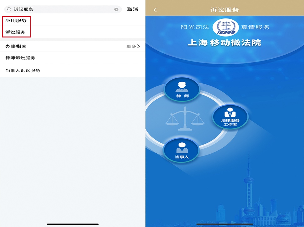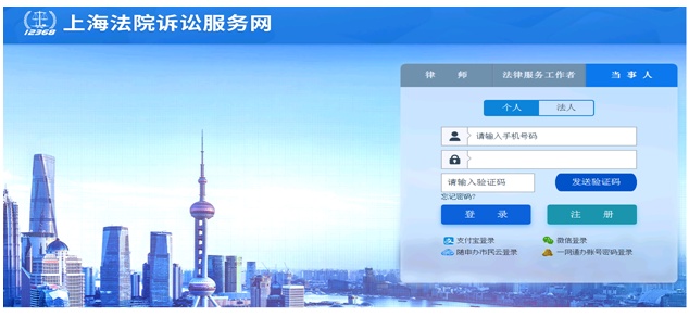 搜索“上海法院12368”并关注,点击诉讼服务,当事人选择当事人,律师选择律师,当事人首次登录需注册。