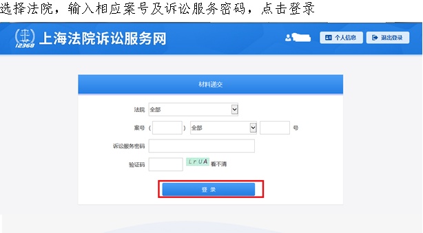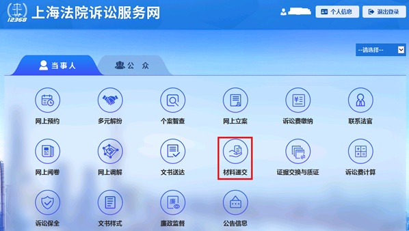 输入信息并完成实名认证后,返回上海法院诉讼服务网登录,选择当事人栏下方材料递交。