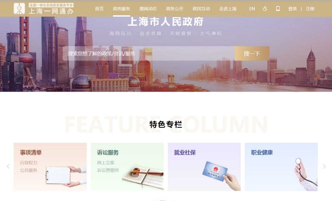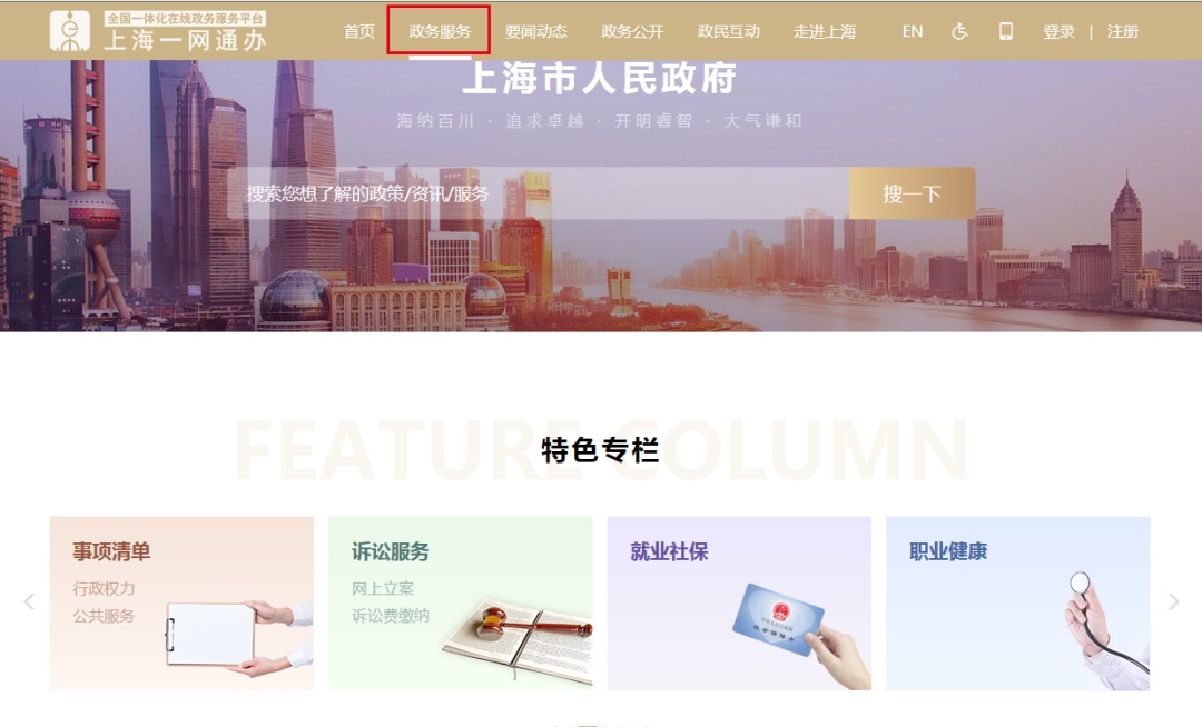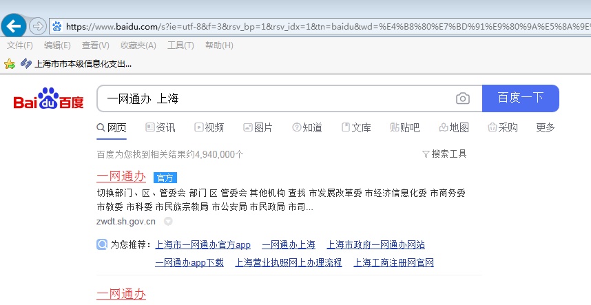 百度搜索“一网通办 上海”,从标有“官方”字样的链接进入。