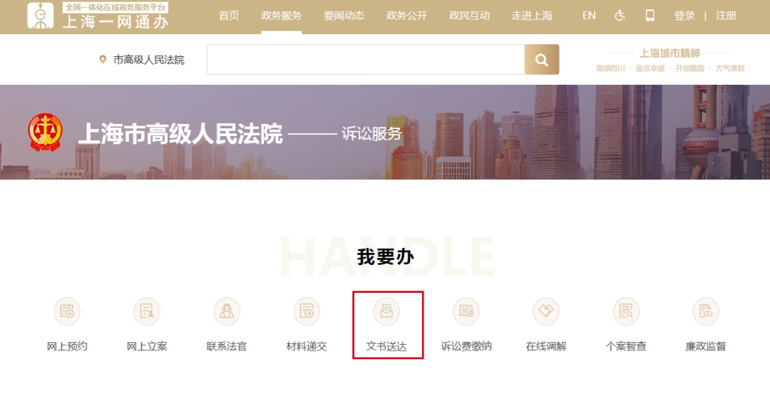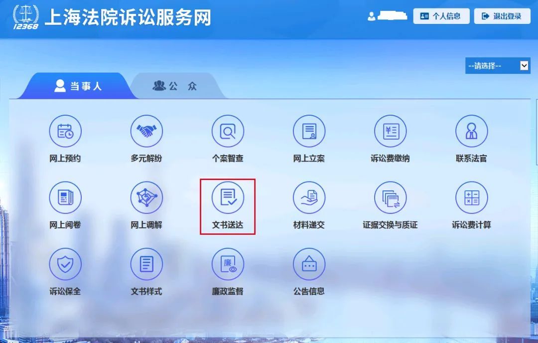 认证成功返回上海法院诉讼服务网登录,选择当事人栏下方文书送达。