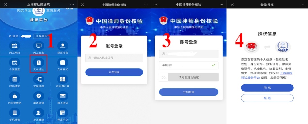 可以使用微信小程序“中国律师身份核验”扫码登录,也可以点击右上角进行执业证号登录,登录后操作同当事人操作。