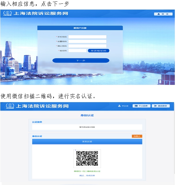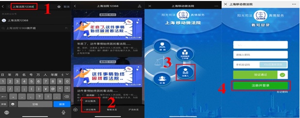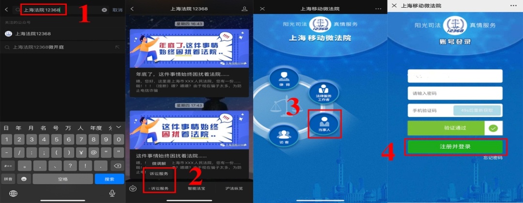 微信搜索“上海法院12368”并关注,点击诉讼服务,当事人选择当事人,律师选择律师,当事人首次登录需注册。