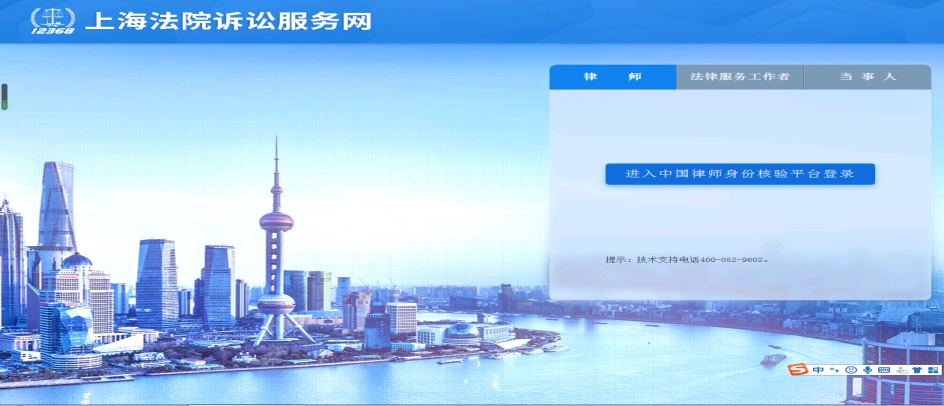 输入网址:http://www.hshfy.sh.cn/shwfy/ssfww/,右上角点击登录按钮,选择律师,点击进入中国律师身份校验平台登录。
